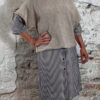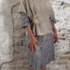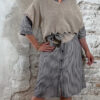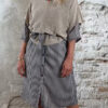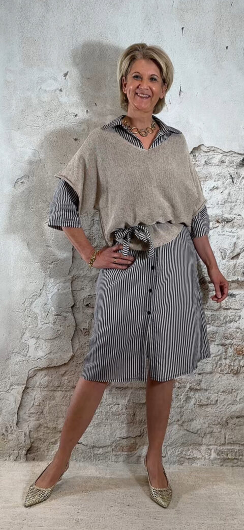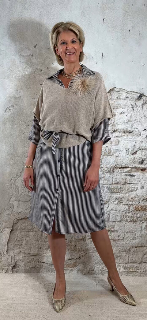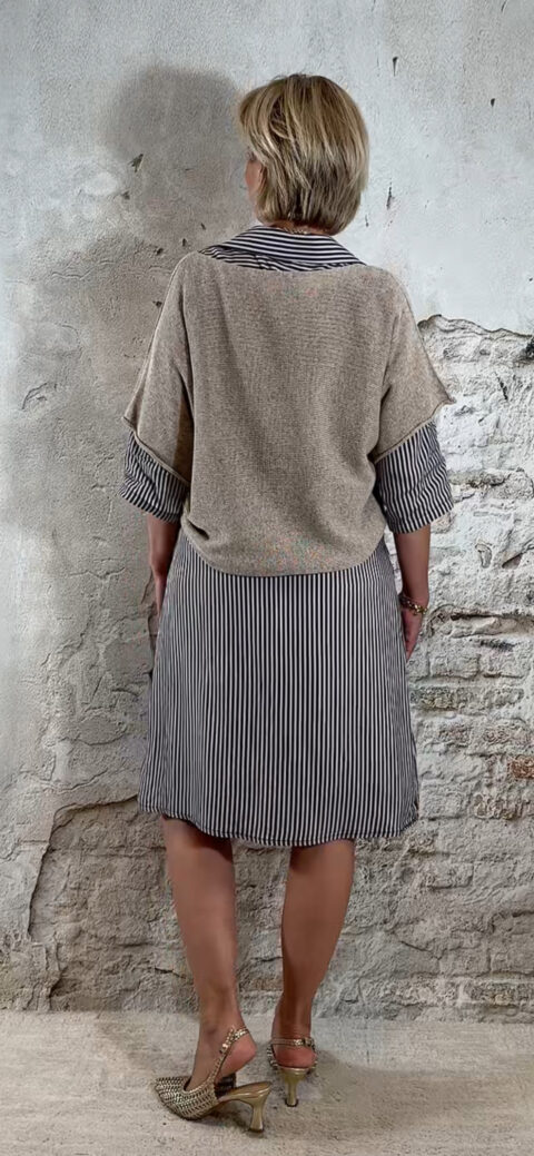 • blouse jurk dames gestreept donkerblauw beige doorknoop strikceintuur 3/4 mouw