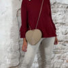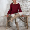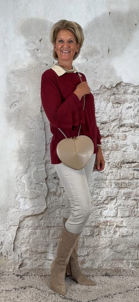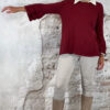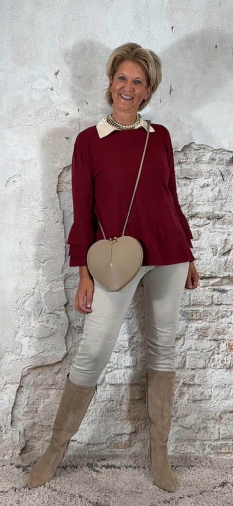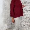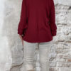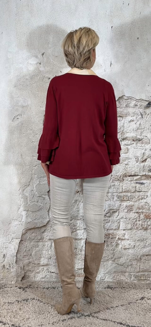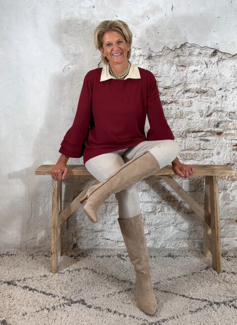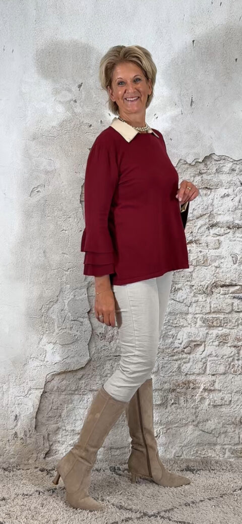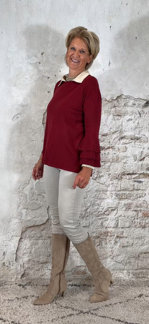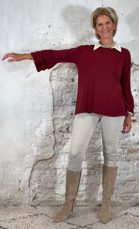 Bibi pullover met flare mouwen in drie laagjes en oprollende halslijn. Zachte viscosemix met modal. Verkrijgbaar in donkerblauw, bordeaux, bruin en zwart. One size 36 t/m 42.