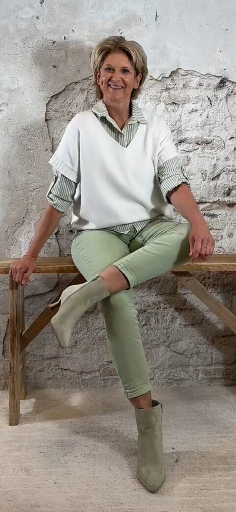 De Bibi sehr sucre blouse streep in lindegroen is een frisse, vrouwelijke blouse met een speels karakter. De subtiele streep in combinatie met het kleine bubbel-effect “sehr sucre” geeft deze blouse nét dat bijzondere detail.