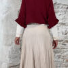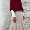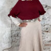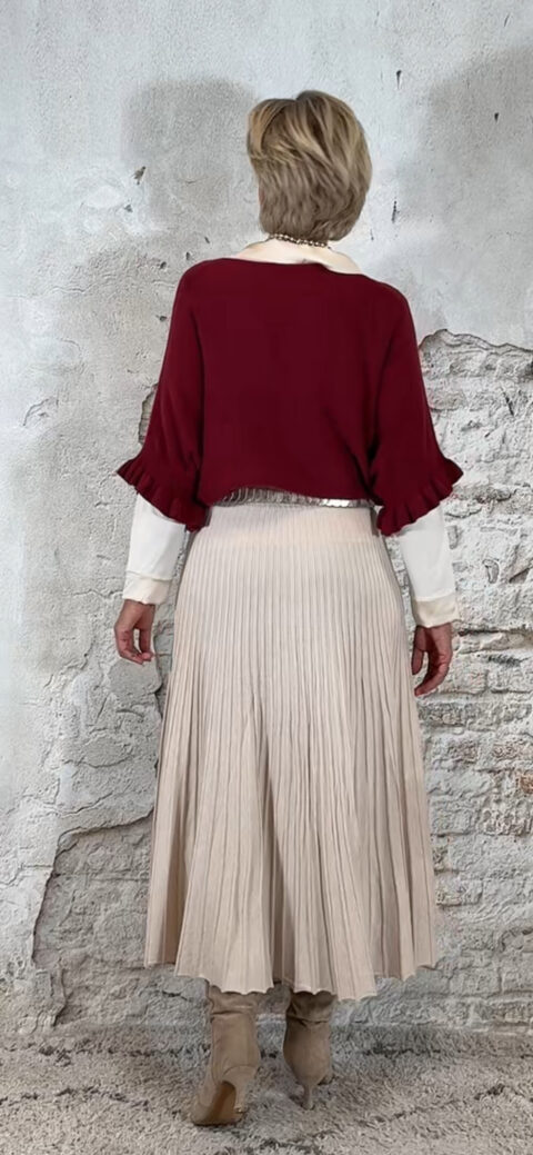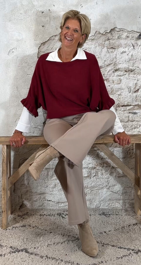 Viscose mix vlindertrui met boothals en korte mouwen met ruffle manchet. Sluit onder mooi aan en daardoor perfect op rok of wijde broek. Ook leuk over een blouse.