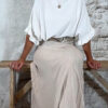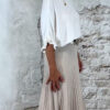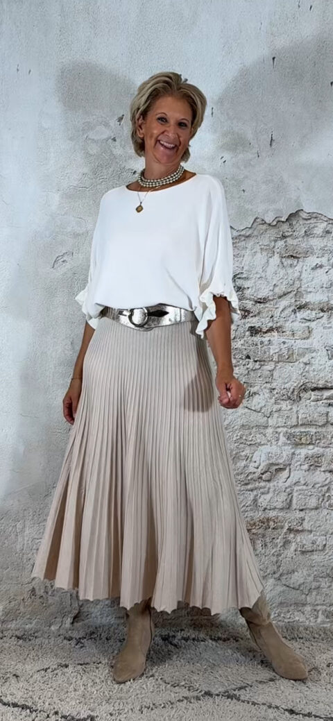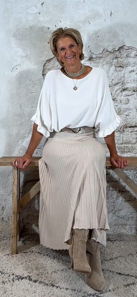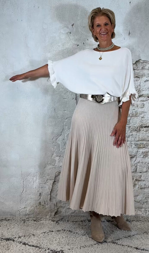 Viscose mix vlindertrui met boothals en korte mouwen met ruffle manchet. Sluit onder mooi aan en daardoor perfect op rok of wijde broek. Ook leuk over een blouse.