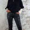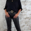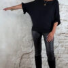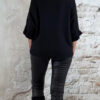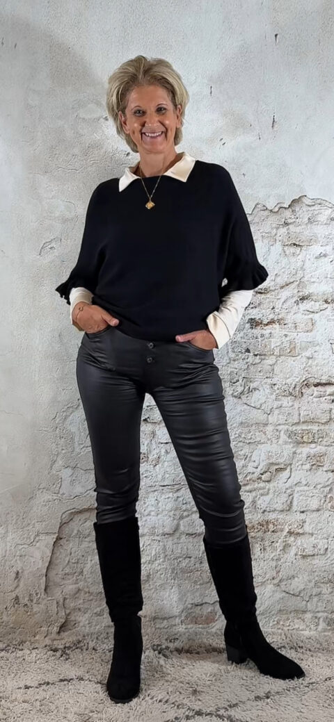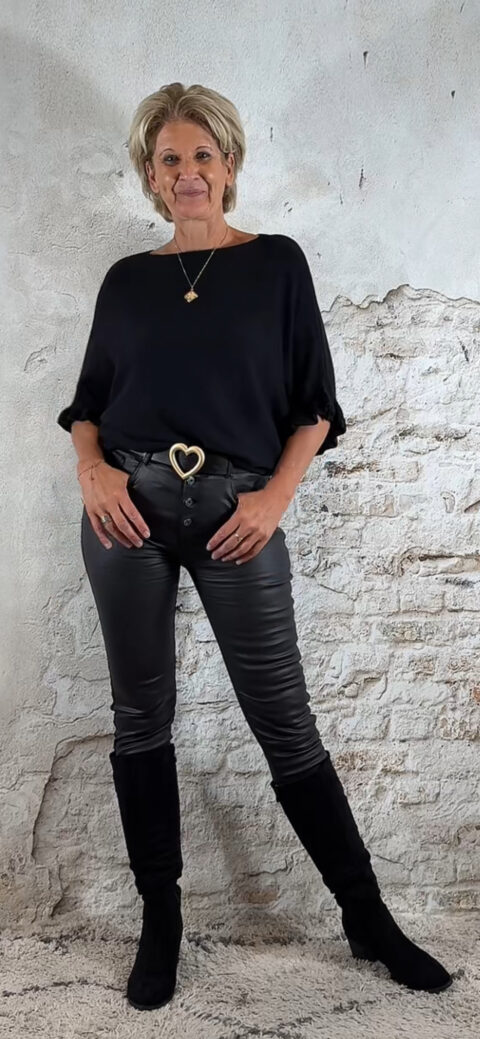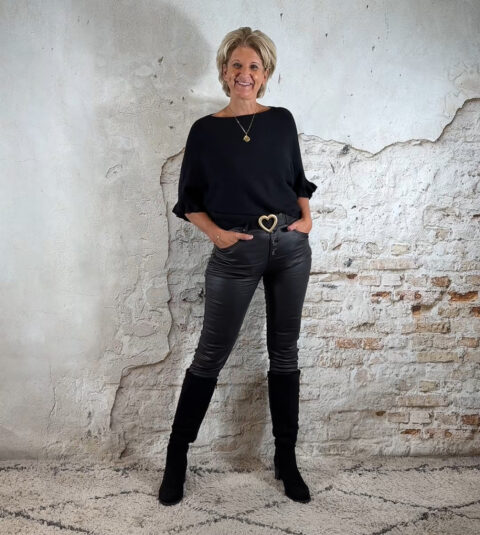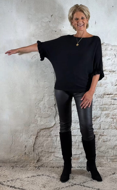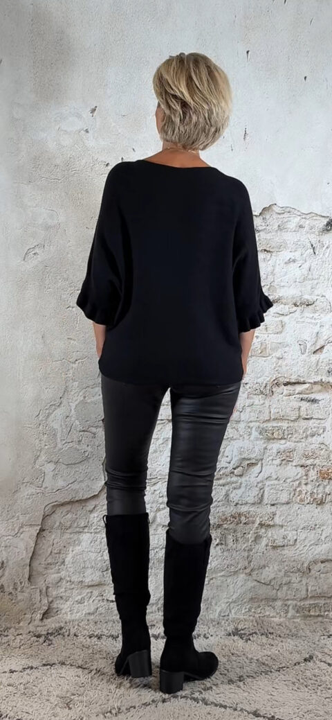 Viscose mix vlindertrui met boothals en korte mouwen met ruffle manchet. Sluit onder mooi aan en daardoor perfect op rok of wijde broek. Ook leuk over een blouse.