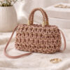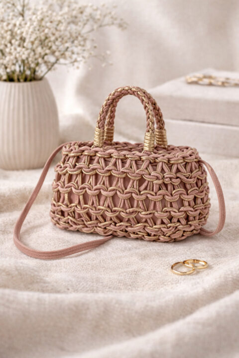 De tas is gebreid met twee kleuren koord, goud en oudroze, wat zorgt voor een subtiele shimmer en een warme uitstraling. De binnenkant is volledig gevoerd en praktisch ingedeeld. Binnenin vind je een extra open vakje én een ritsvakje voor kleinere essentials.