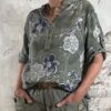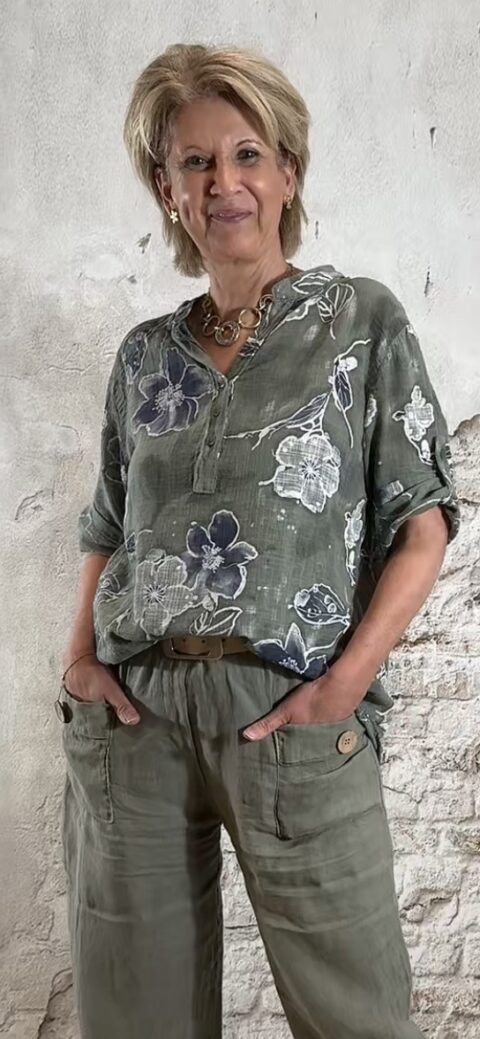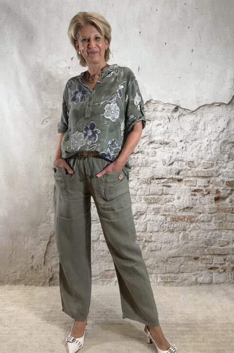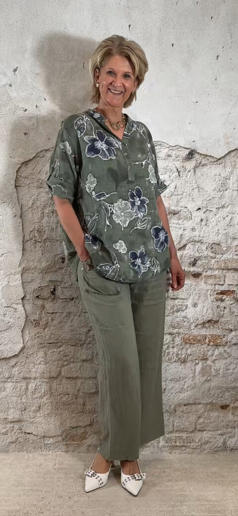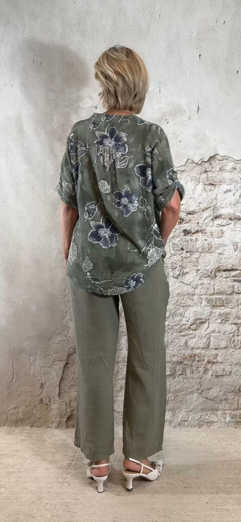 Deze cotton linnen blouse voor dames met bloemenprint is een fijne combinatie van luchtig en vrouwelijk. De blouse is verkrijgbaar in meerdere kleuren zoals khaki, zand, oudroze en taupe/bruin, allemaal met een frisse bloemenprint in wit en blauw.