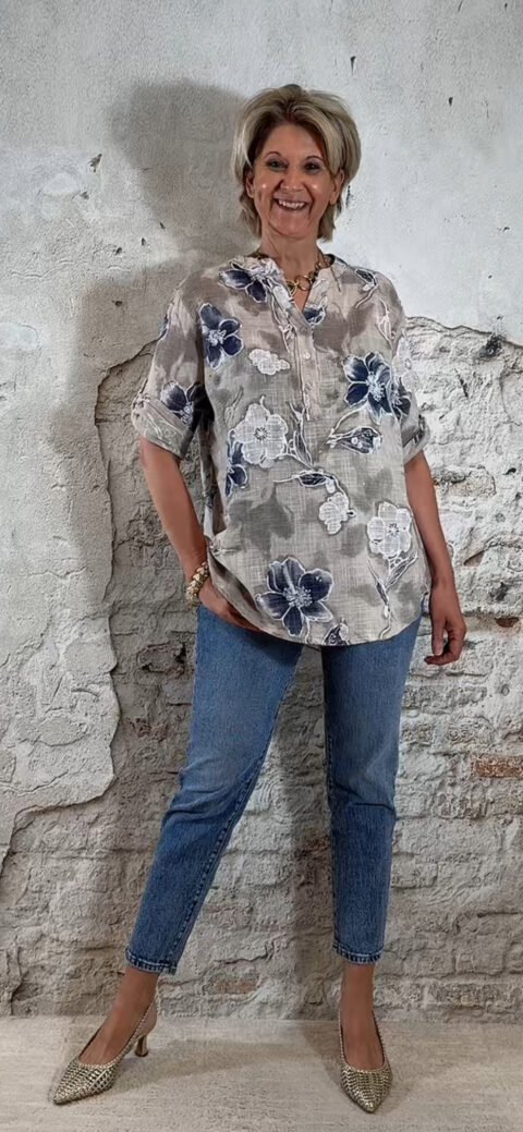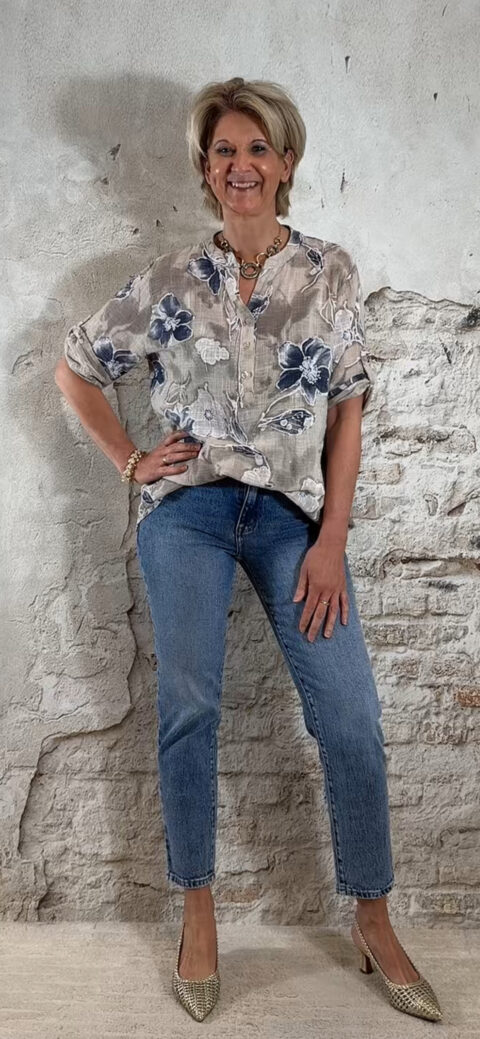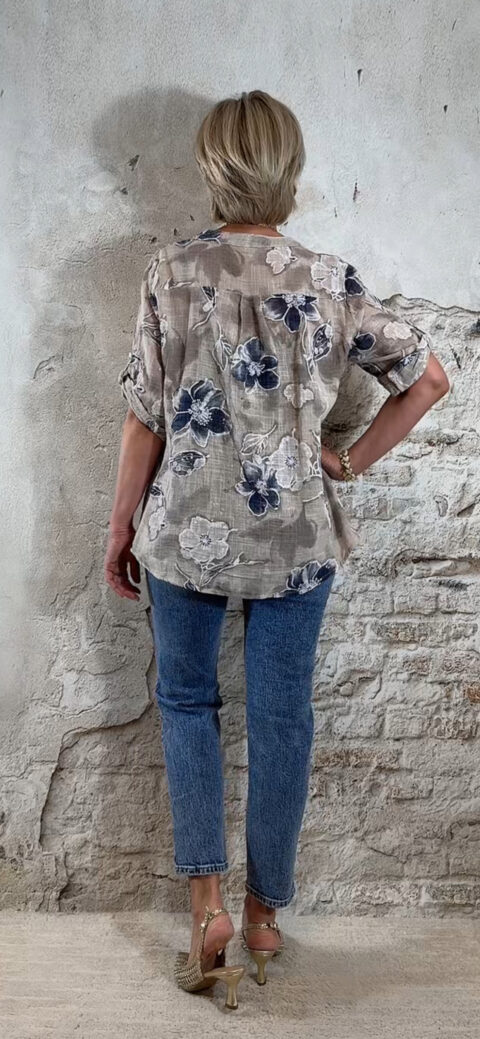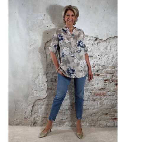 Deze cotton linnen blouse voor dames met bloemenprint is een fijne combinatie van luchtig en vrouwelijk. De blouse is verkrijgbaar in meerdere kleuren zoals khaki, zand, oudroze en taupe/bruin, allemaal met een frisse bloemenprint in wit en blauw.