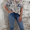De halve knoopsluiting met een klein boordje en v-halsje geeft de blouse een zachte en vrouwelijke uitstraling. De stof voelt licht en comfortabel aan, perfect voor warmere dagen.