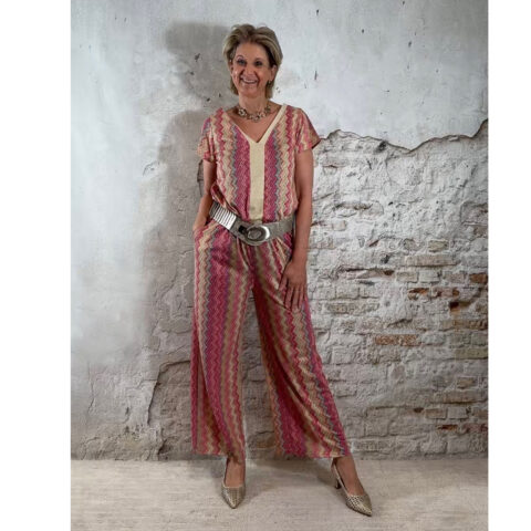 Dit dun gebreide truitje voor dames met zigzag Inka print in roze en jeansblauw is een speels en stijlvol item met een subtiele glans. Het fijne lurex draadje geeft een luxe uitstraling, zonder dat het prikt, waardoor het truitje heerlijk comfortabel draagt.