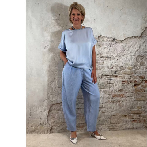 Het Elza glans shirt is een elegante basic met een subtiele satijnglans. Het shirt heeft een ronde hals en korte mouwen met een klein omslagje, wat zorgt voor een nette en vrouwelijke uitstraling.