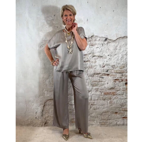 Het Elza glans shirt in taupe is een luchtig en elegant shirt met een subtiele zijdeachtige glans. De zachte glanzende viscose stof in taupe geeft het shirt een luxe uitstraling, terwijl het model comfortabel en makkelijk te combineren blijft.
