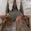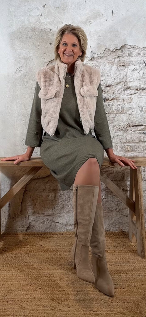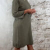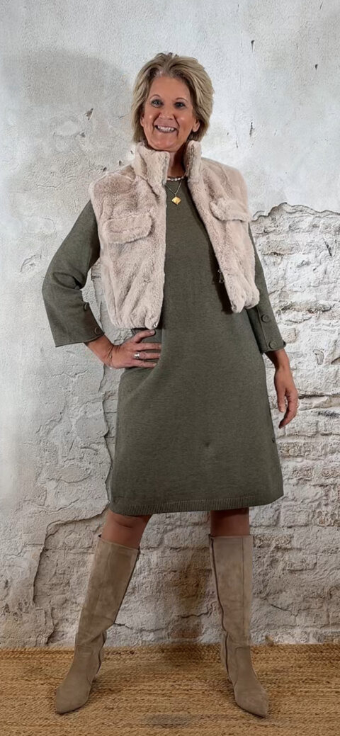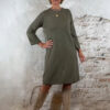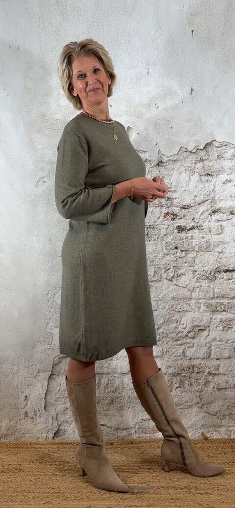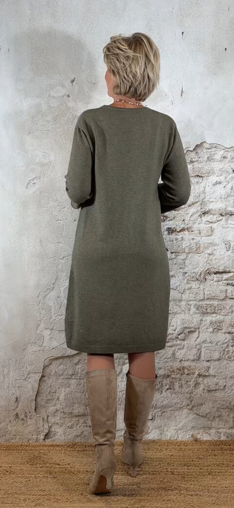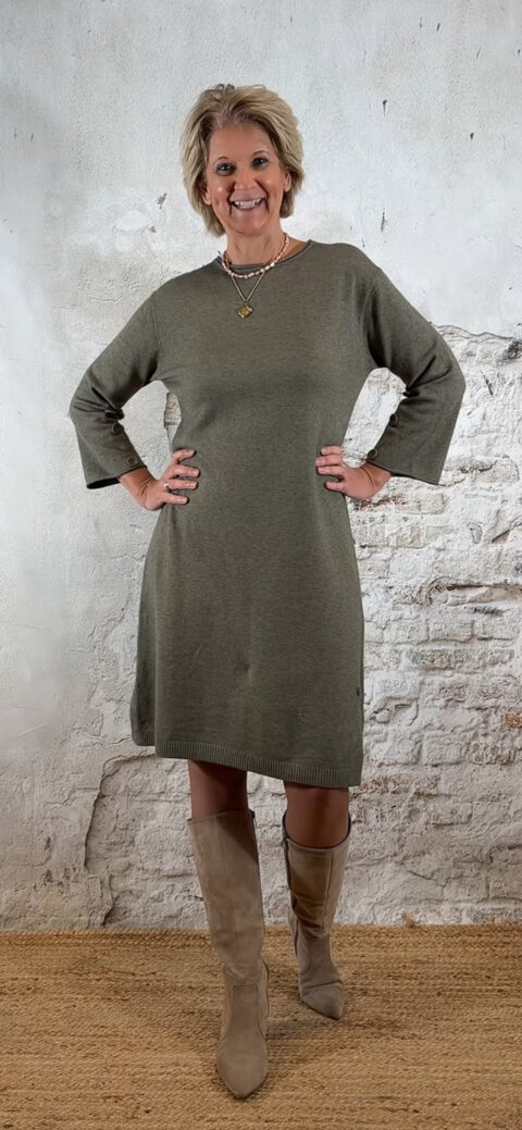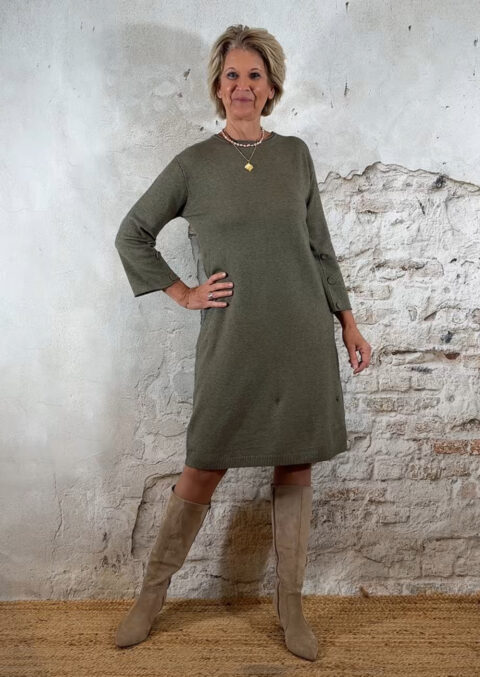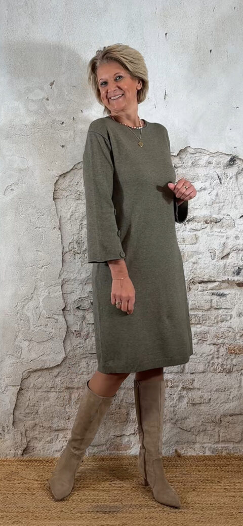 Zachte gebreide jurk in khaki met ronde hals, 3/4 mouw en picpac knopen. Cozy maar netjes — ideaal voor elke dag, werk of een etentje.