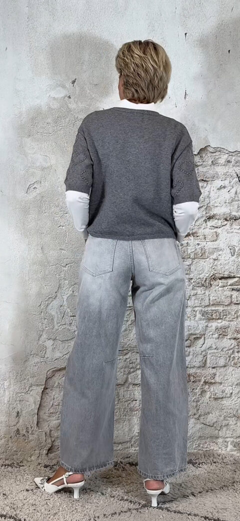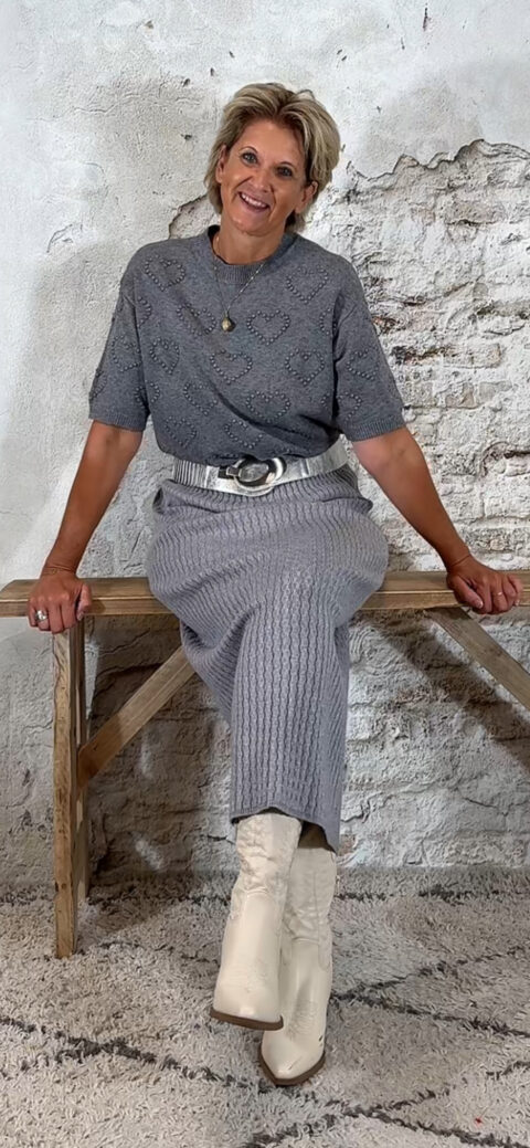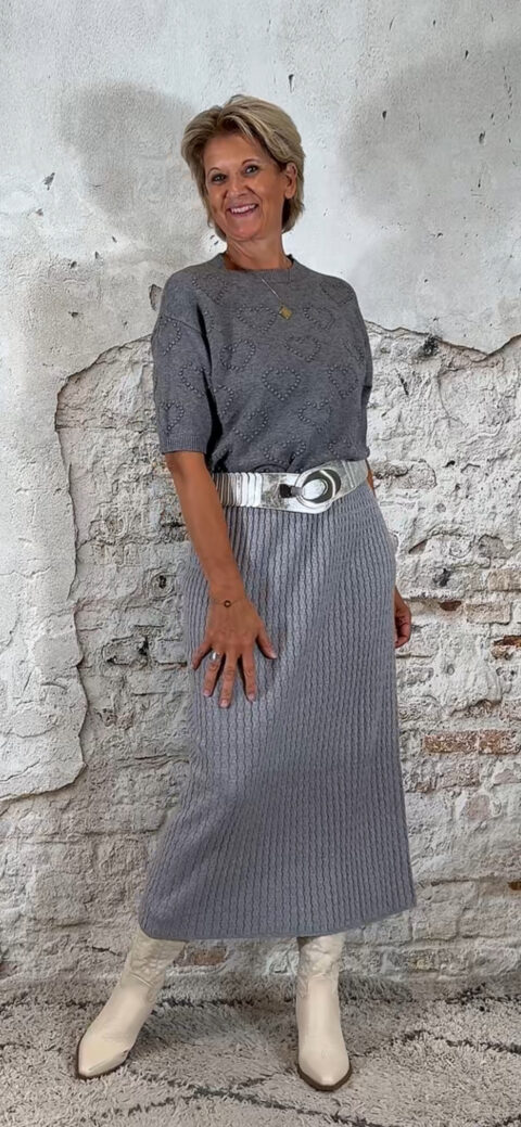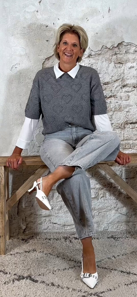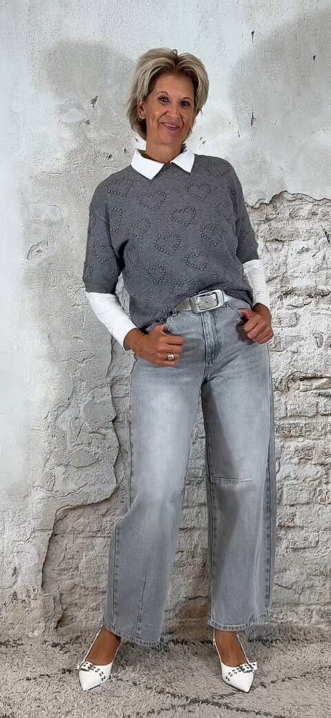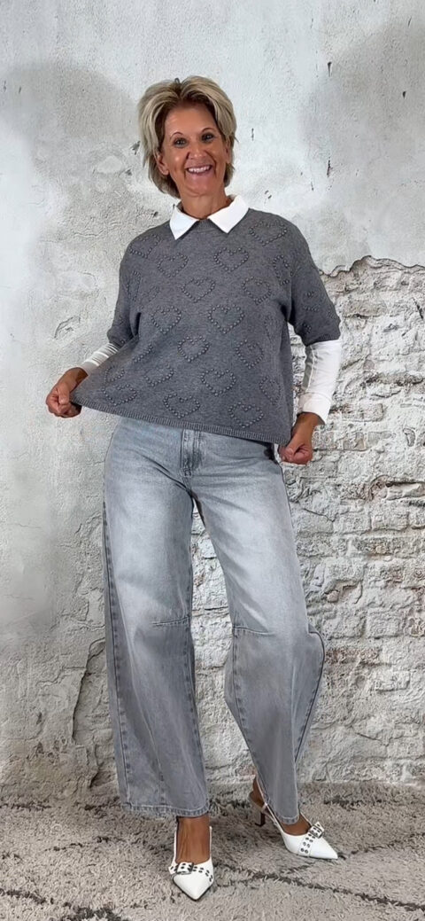 Pullover met ronde hals en korte mouw, ingebreid hartjes patroon. Viscose mix zonder wol – zacht en comfortabel.