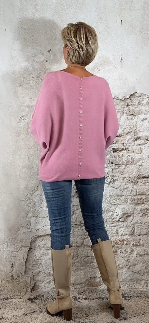 Met wijde mouwen die smal toelopen en een aansluitende onderkant die zorgt voor een mooie bloezende look, valt hij soepel over je buik – ideaal als je dat net wat wilt camoufleren. Achterop, midden over de rug, zit een verticale rij subtiele pareltjes voor een chique touch.
