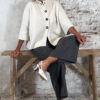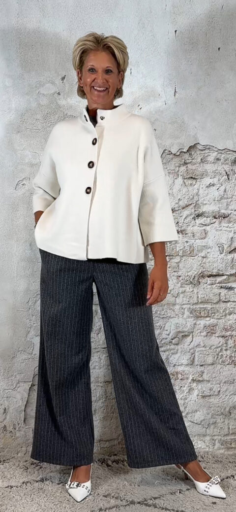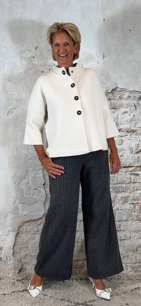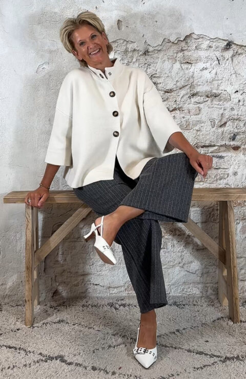 Het Evy 4-knoops vest in beige is een stijlvol en veelzijdig knit-item. Gemaakt van een stevige kwaliteit die mooi in model blijft en zacht aanvoelt. De 3/4 mouwen en het hoge boord geven het vest een elegante uitstraling, terwijl de handige drukknopen zorgen voor een praktische en nette afwerking.