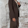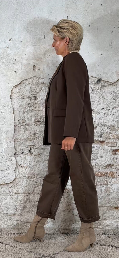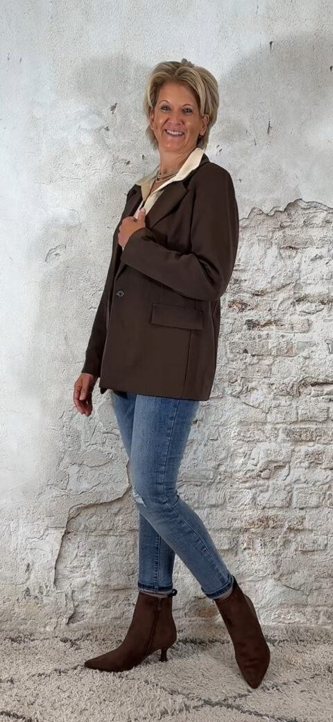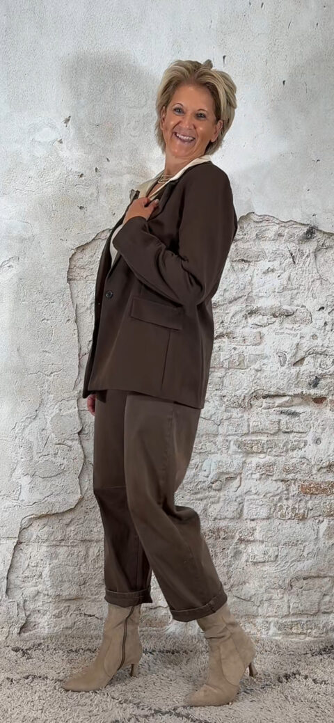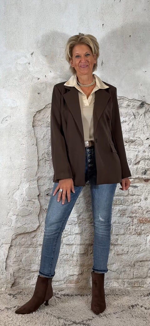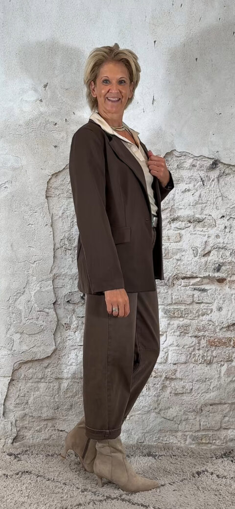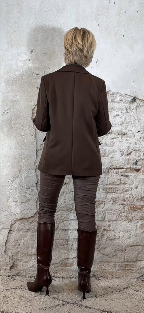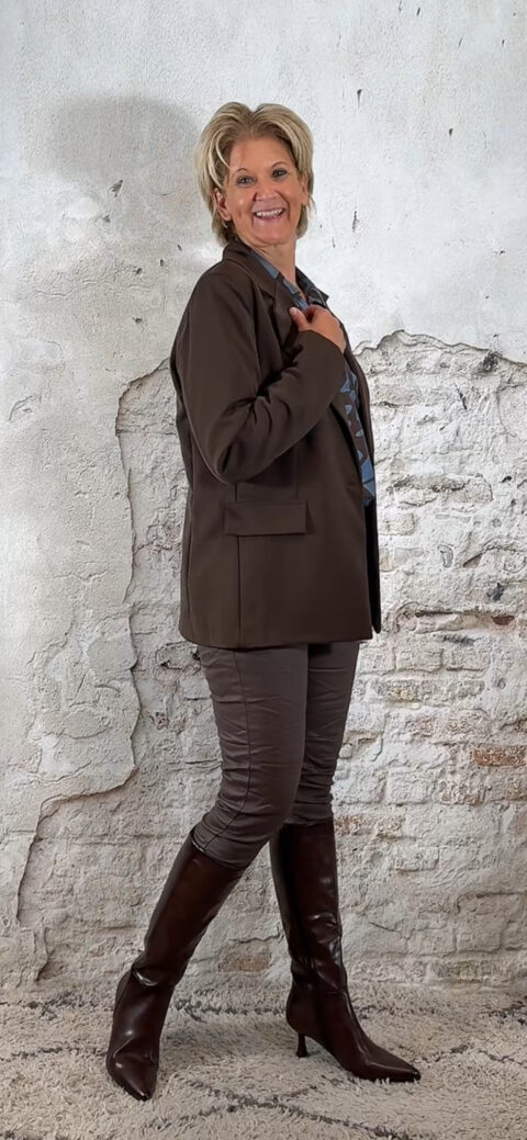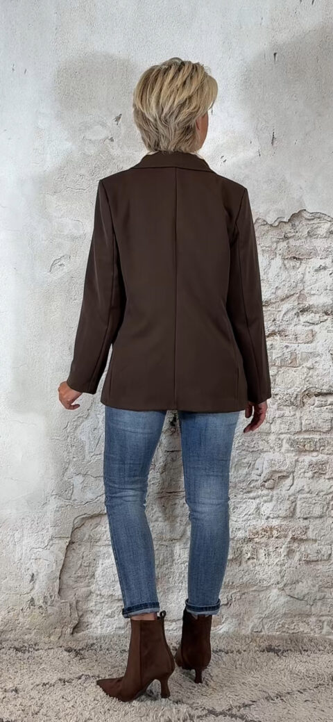 • Elastan: geeft de stof net dat beetje stretch, zodat de blazer mooi aansluit én comfortabel meebeweegt.