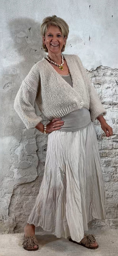 Het vest valt kort en iets oversized, waardoor het mooi combineert met rokken en pantalons.