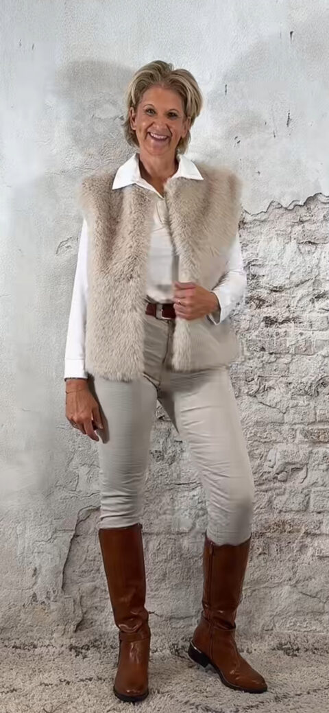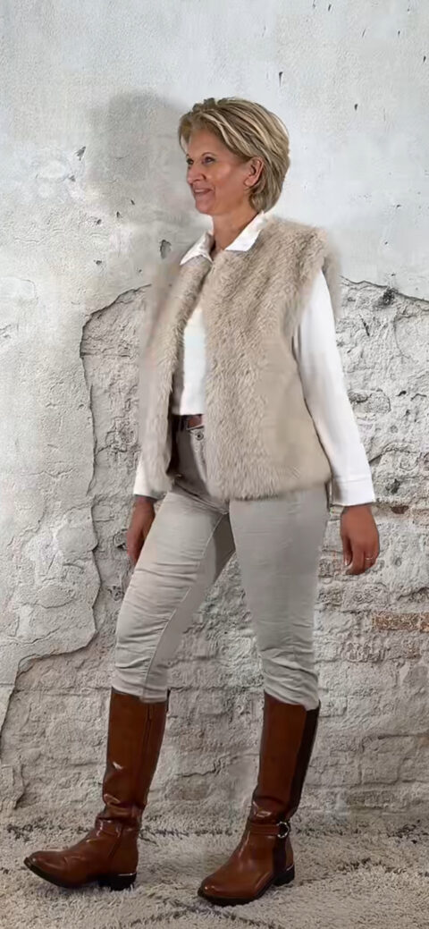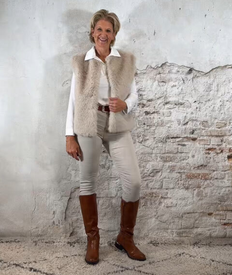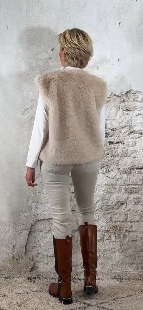 De Evy fake fur bodywarmer in beige is een echte musthave voor laagjesliefhebbers. De zachte fake fur stof voelt heerlijk luxe aan en geeft elke outfit een warme en stijlvolle uitstraling. Het rechte model zonder kraag en sluiting maakt deze bodywarmer eindeloos te combineren – draag hem over een blouse, trui of jurk voor een casual of juist chique look.