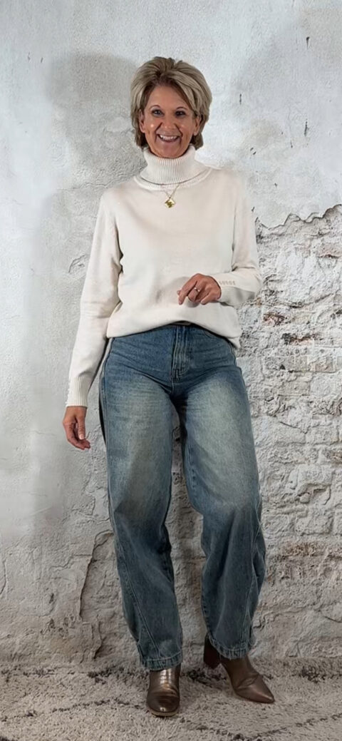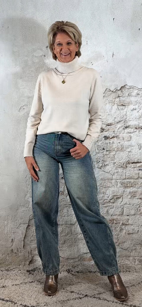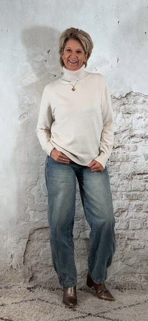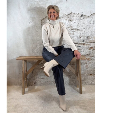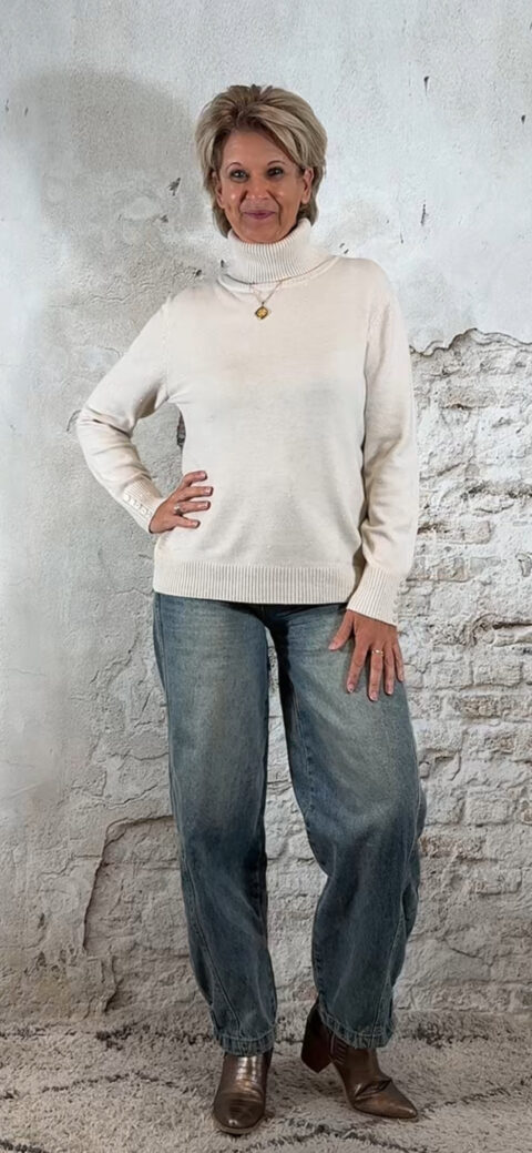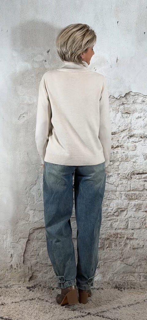 De Evy Frozen Coltrui is een warme, vrouwelijke trui met glinsterend detail — alsof er sneeuwvlokjes in de stof gevangen zitten.