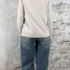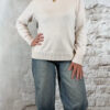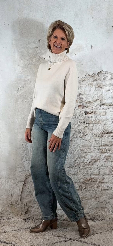 De trui heeft een ribbelcol en ribmanchetten met een elegante rij knoopjes met steentje — een klein detail dat het verschil maakt.