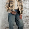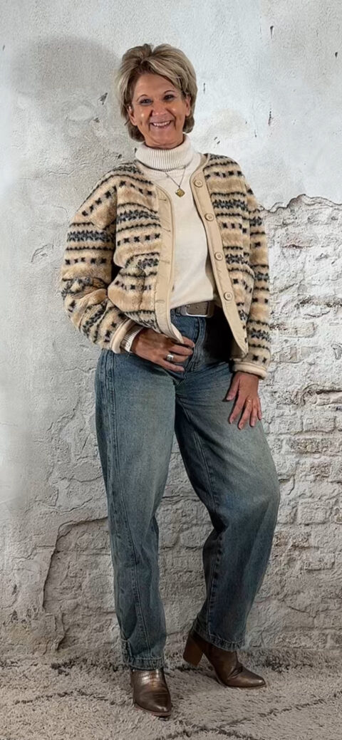 Warme coltrui met subtiele glansdraad, ribcol en manchetten met knoopjes.