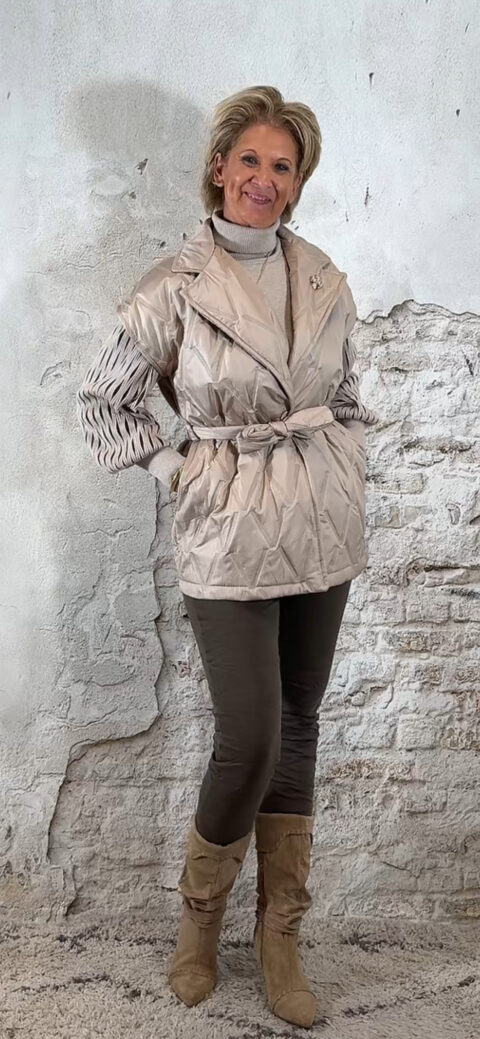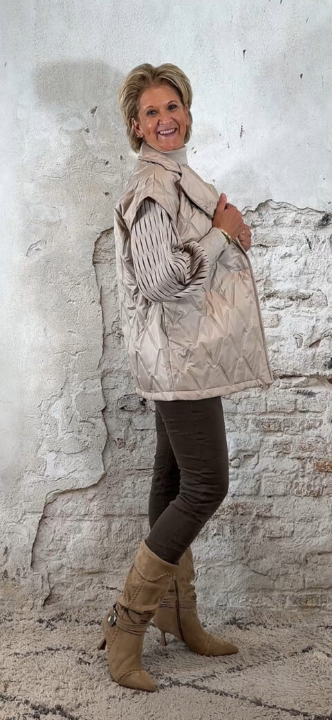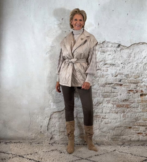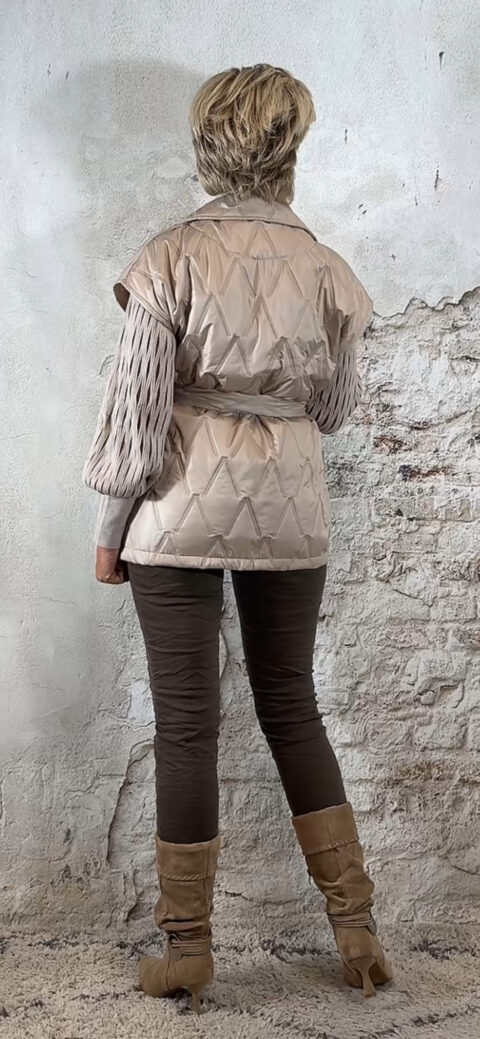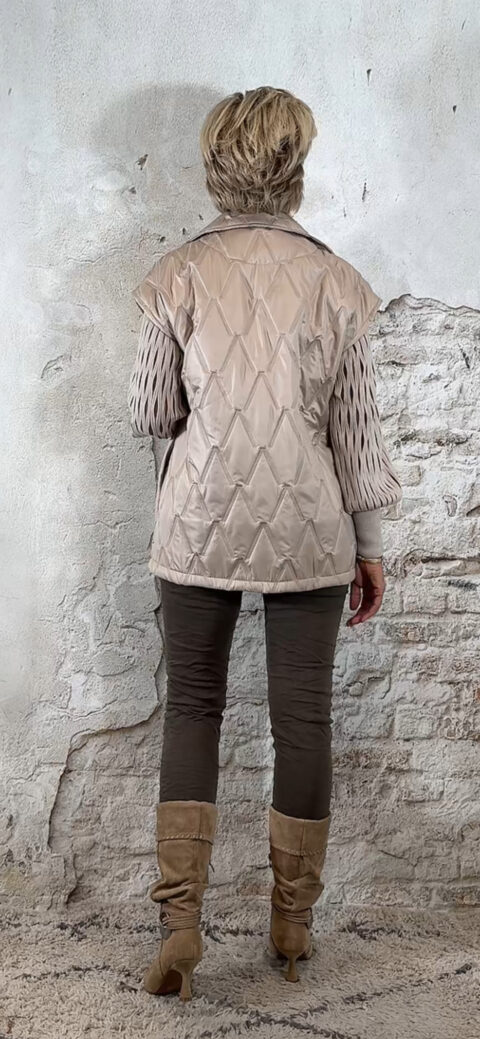 Gewatteerde bodywarmer in blazerstijl met reverkraag, tailleband en kapmouw. Verkrijgbaar in zand, bruin, bordeaux en zwart.