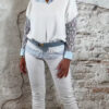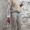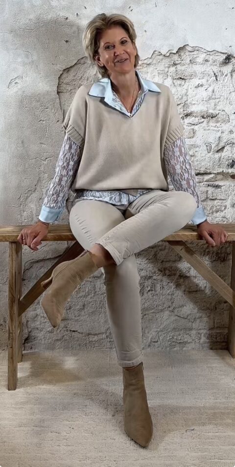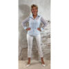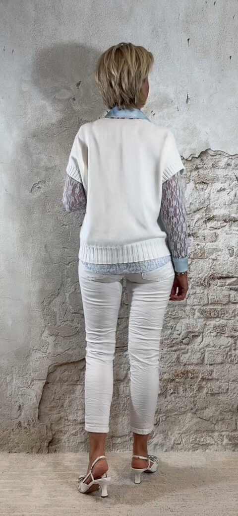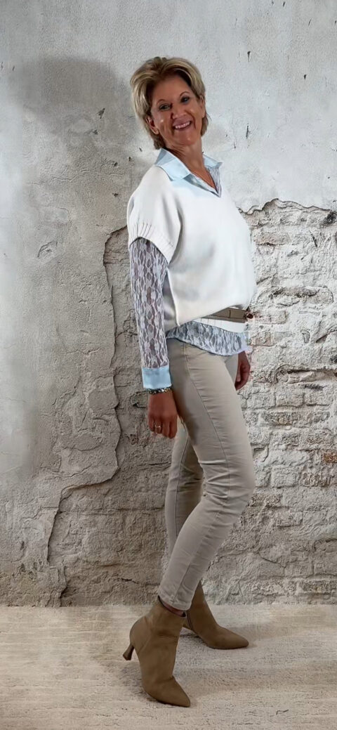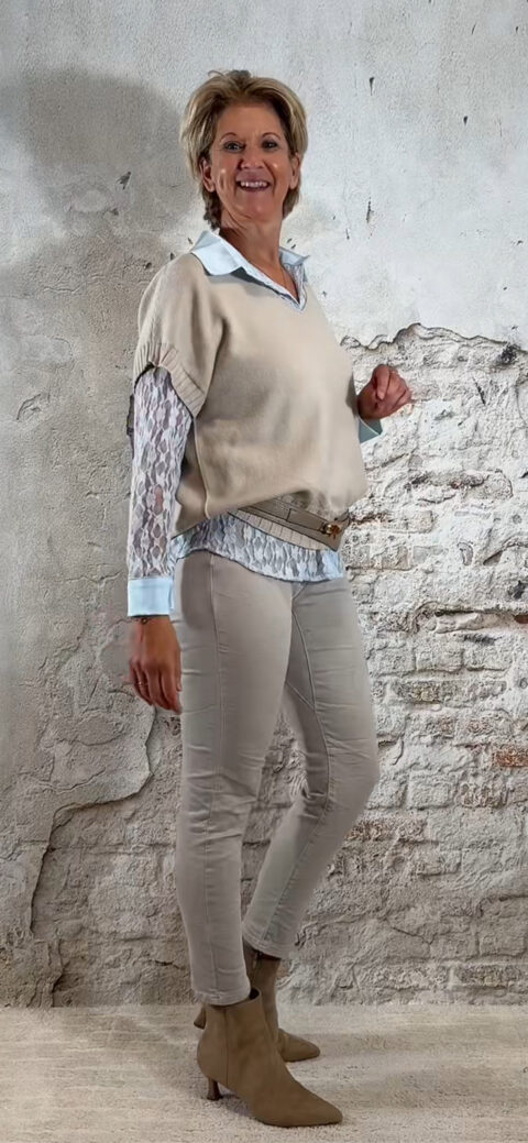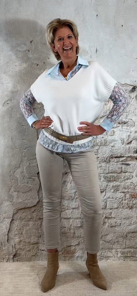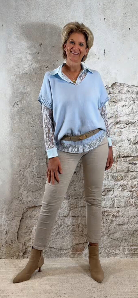 De blouse sluit met een knoopsluiting aan de voorkant en valt mooi recht. Door de stretch in het kant beweegt hij prettig mee en zit hij niet strak. Perfect om zo te dragen op een jeans of pantalon, maar ook heel mooi onder een blazer.