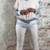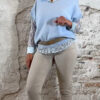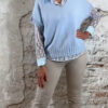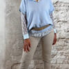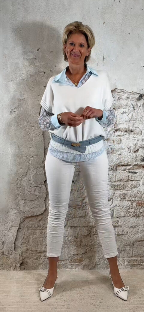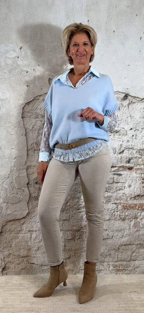 Deze blouse is verkrijgbaar in lichtblauw en wit.