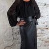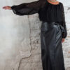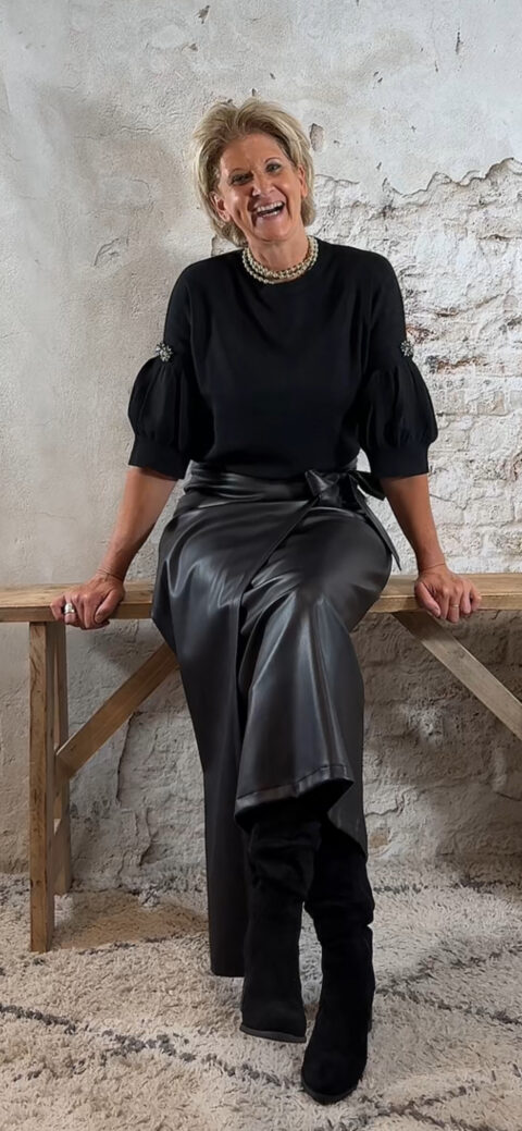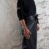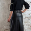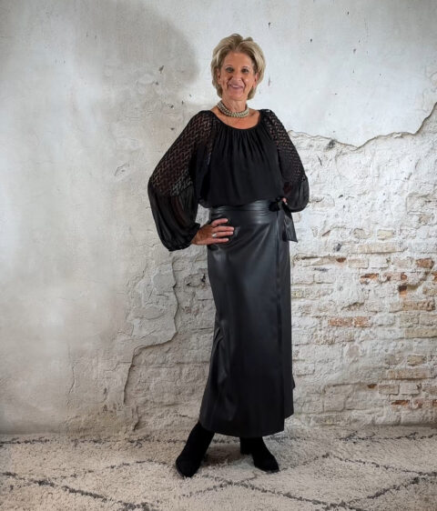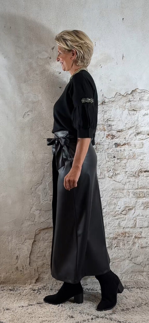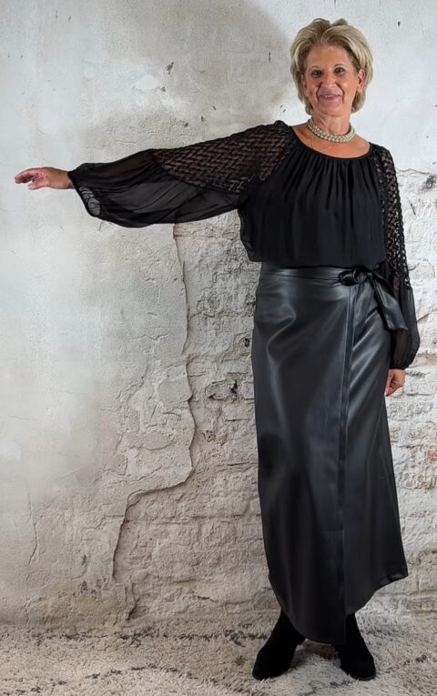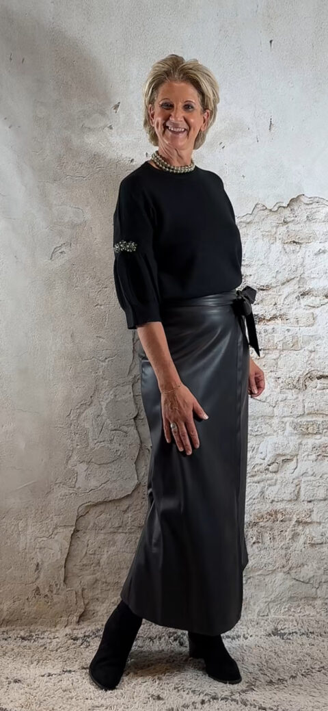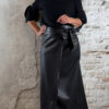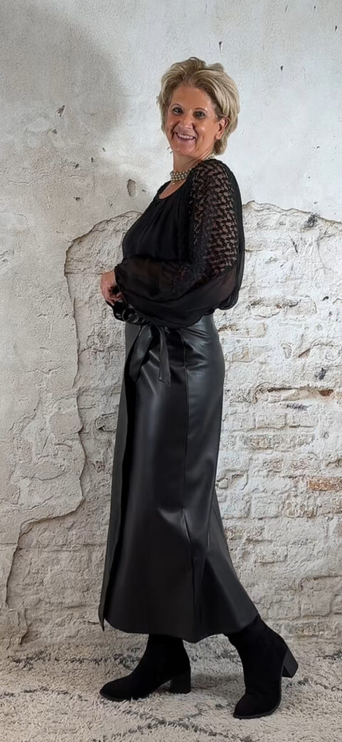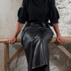 De Evy leatherlook maxi rok in zwart is een stijlvolle en vrouwelijke rok met een stoere twist. Het model lijkt een overslagrok, maar is volledig dichtgestikt – zo valt hij nooit open, ook niet wanneer je gaat zitten of bij een stevige wind. De strik aan de overslaglap geeft een speels detail en accentueert de taille.