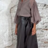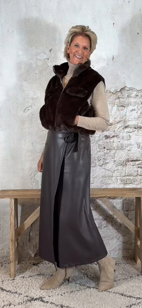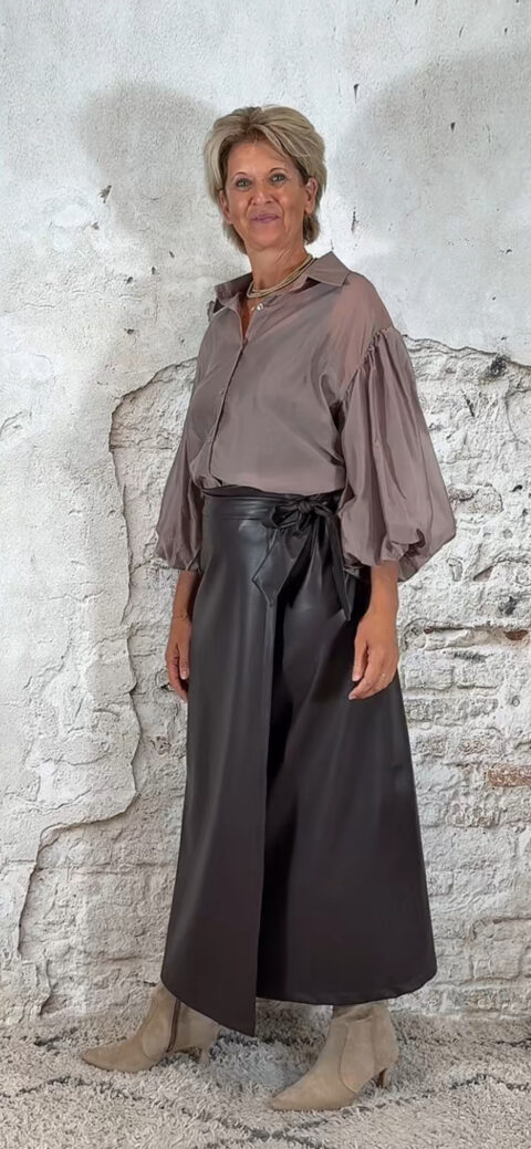 De Evy leatherlook maxi rok in bruin is een stijlvolle en vrouwelijke rok met een stoere twist. Het model lijkt een overslagrok, maar is volledig dichtgestikt – zo valt hij nooit open, ook niet wanneer je gaat zitten of bij een stevige wind. De strik aan de overslaglap geeft een speels detail en accentueert de taille.