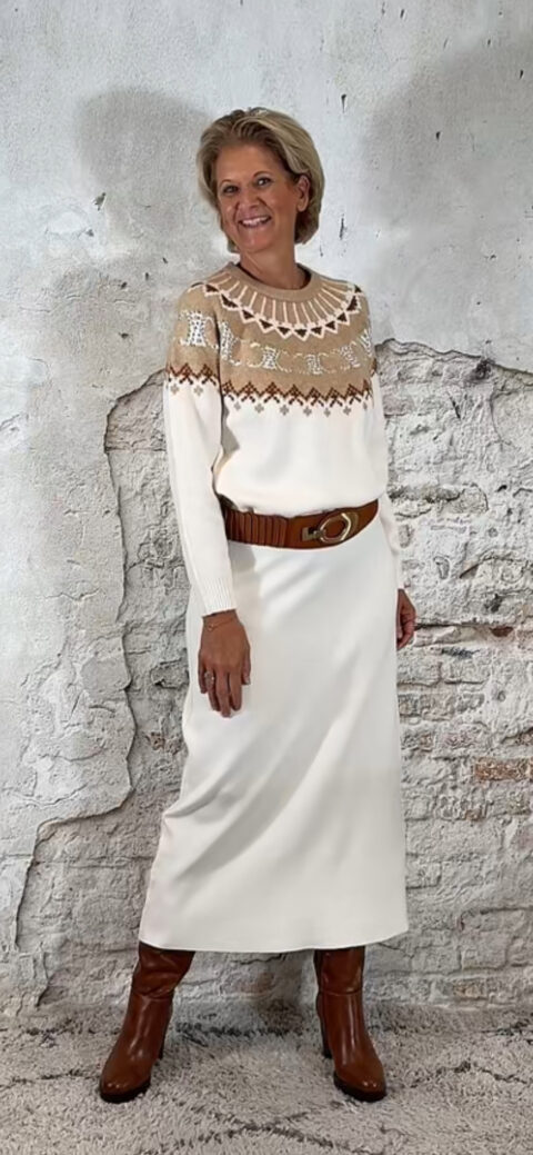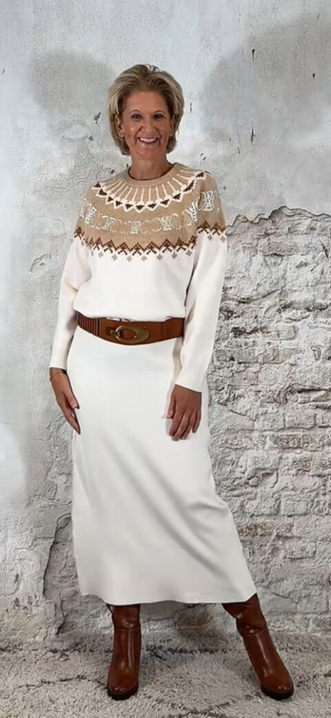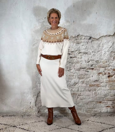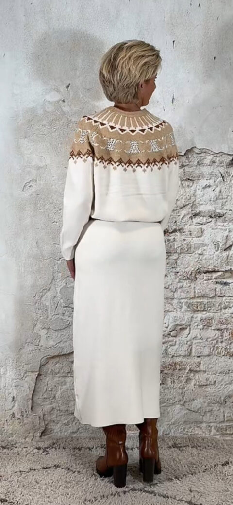 De Evy Noorse trui is een warme knit met een klassieke uitstraling. Rondom de hals is de trui versierd met een Noorse print, subtiel afgewerkt met kleine strass steentjes die voor een chique detail zorgen.