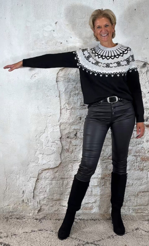 Evy Noorse trui met Noorse print en strass details. Zachte viscosemix met wol. Verkrijgbaar in camel, zwart/grijs, grijs/roze, lichtblauw en bruin. One size 36 t/m 42.