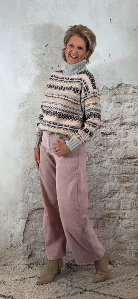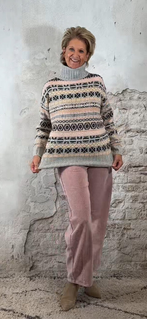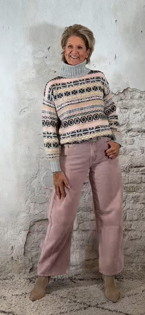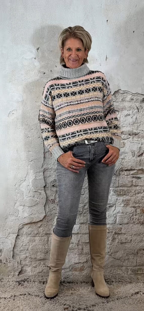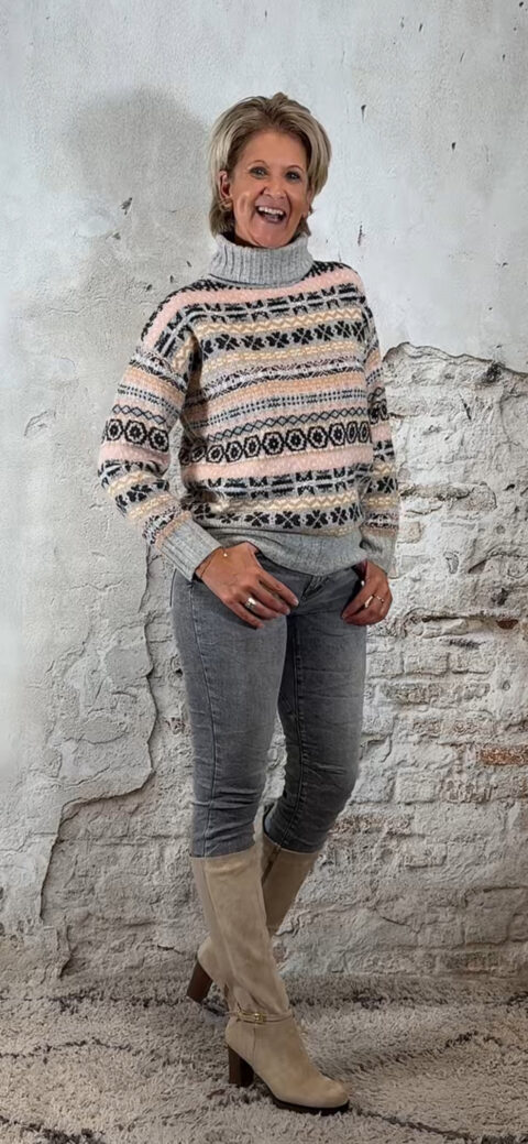 Warme coltrui met Noorse print, ribcol en ribboordjes. Verkrijgbaar in grijs/roze, lila, lichtblauw/rood en zand. One size 36-42.