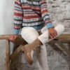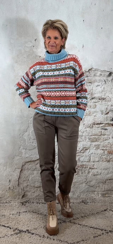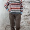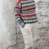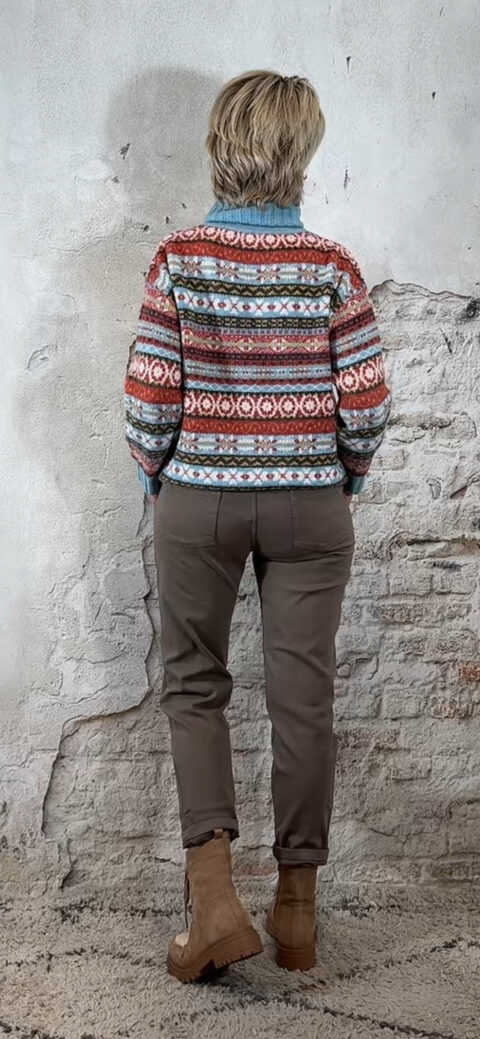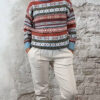 De bovenkant is versierd met een stijlvolle Noorse print, wat de trui een tijdloze, winterse uitstraling geeft.