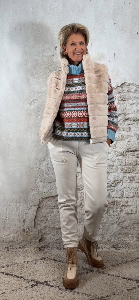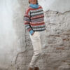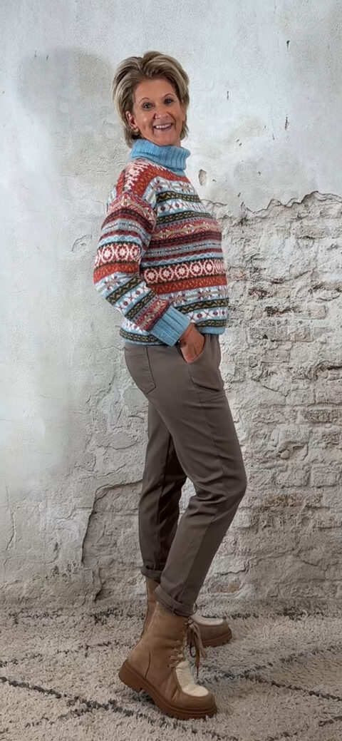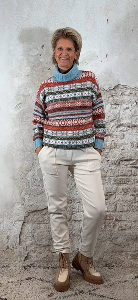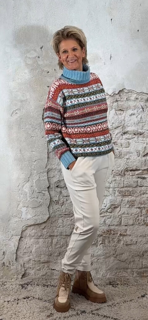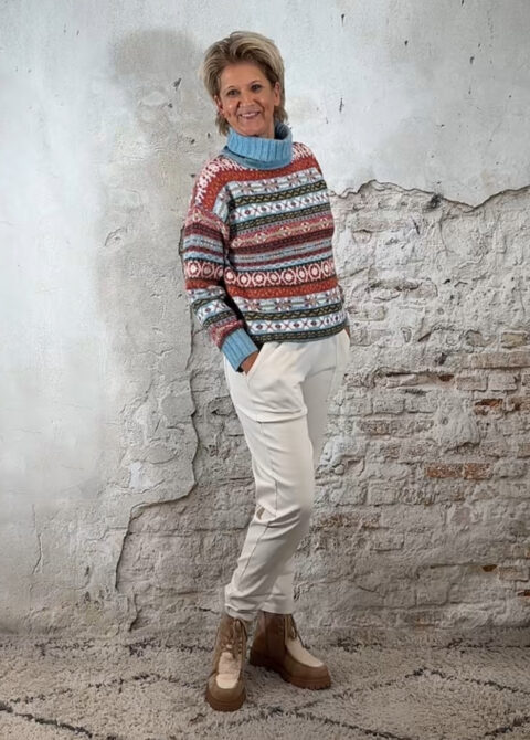 Warme coltrui met Noorse print, ribcol en ribboordjes. Verkrijgbaar in grijs/roze, lila, lichtblauw/rood en zand. One size 36-42.