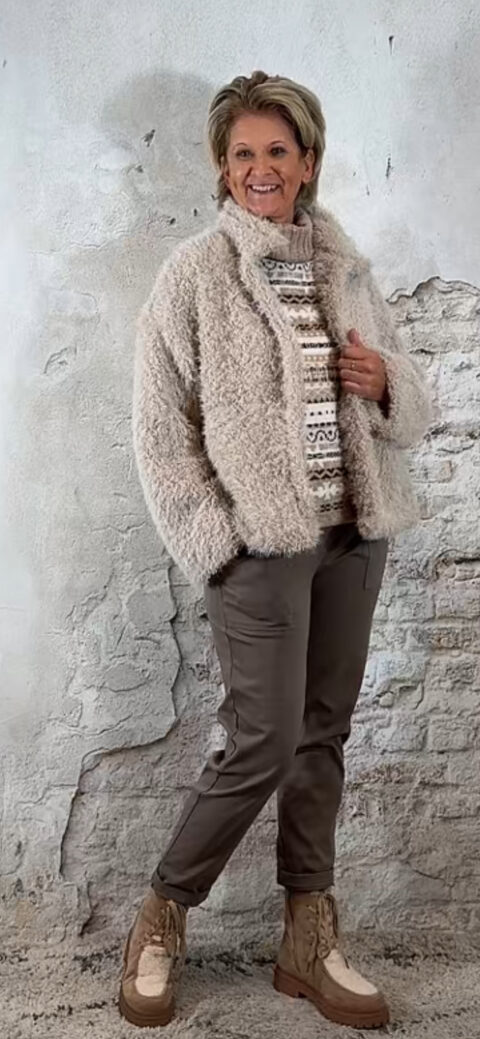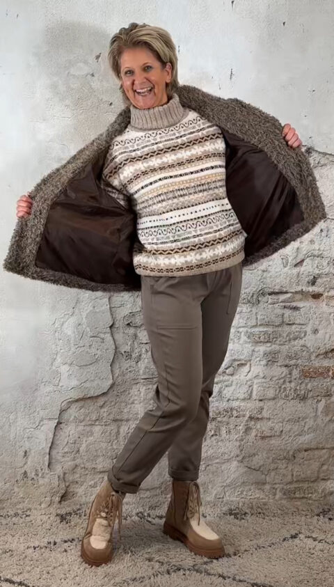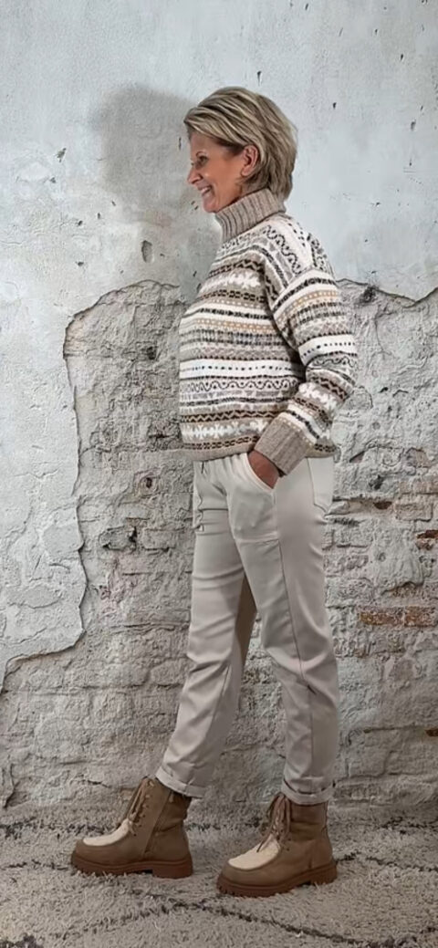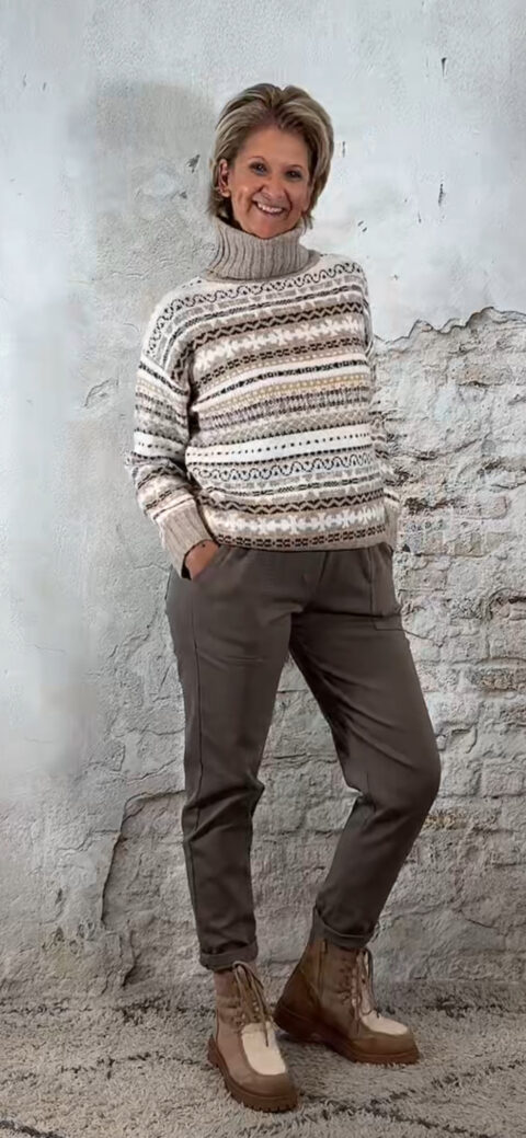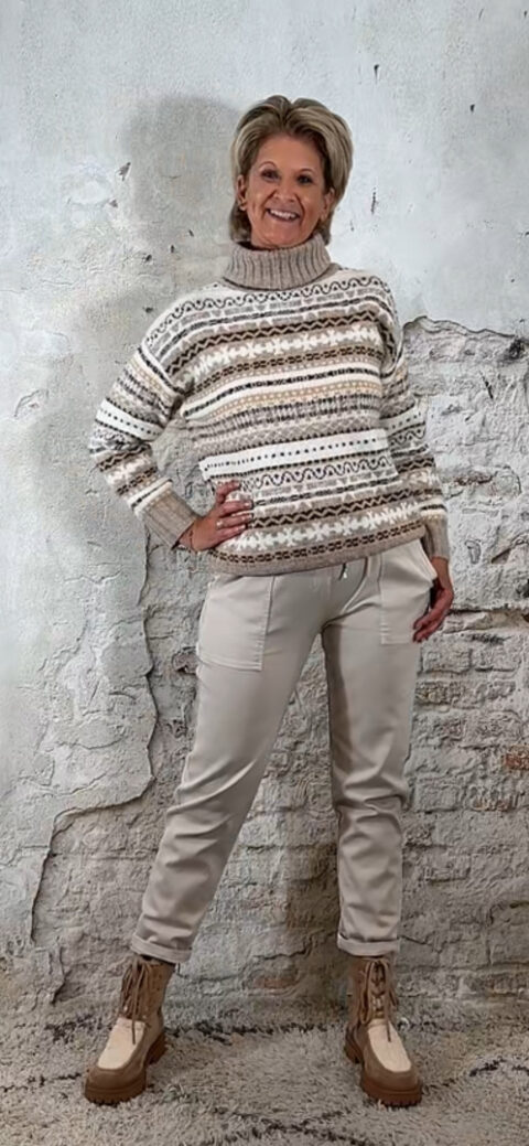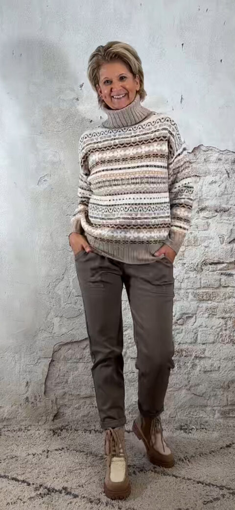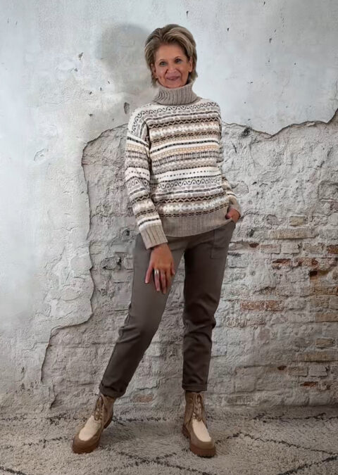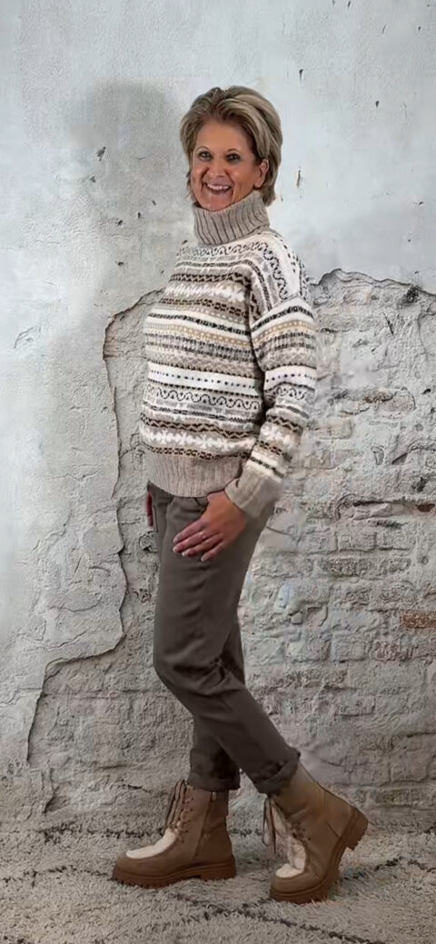 De bovenkant is versierd met een stijlvolle Noorse print, wat de trui een tijdloze, winterse uitstraling geeft.