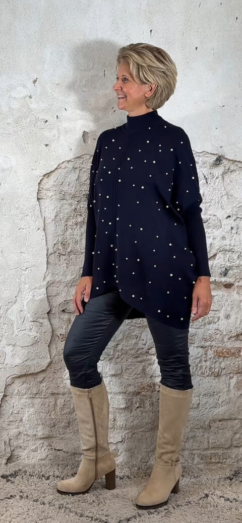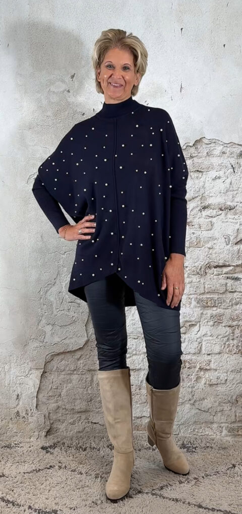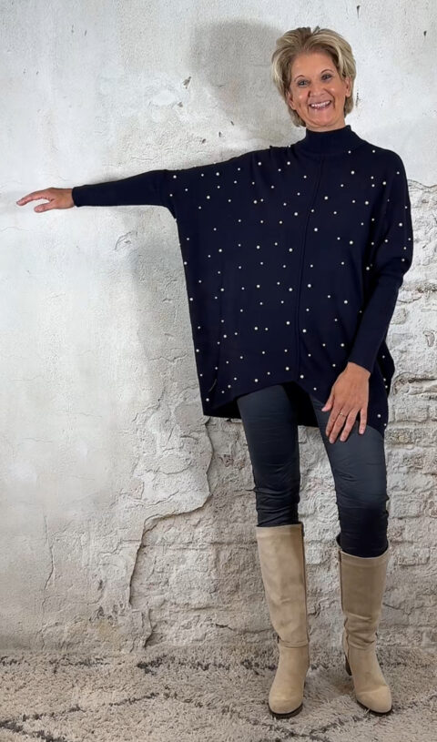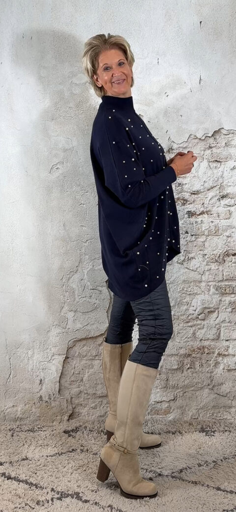 De pareltjes op de voorkant – in verschillende formaten – geven de pullover een chique uitstraling.