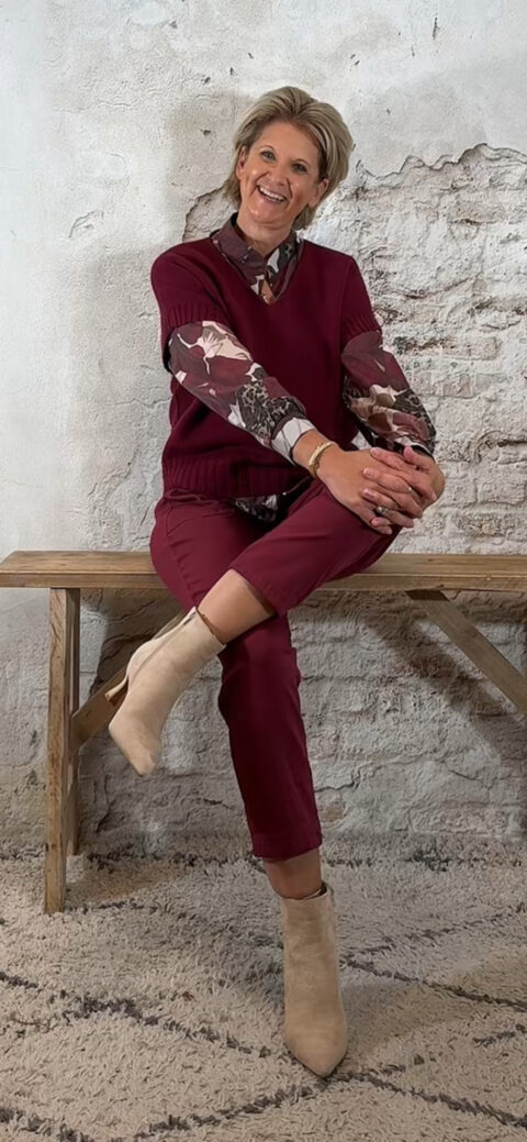 Kleuren: bordeaux, bruin, camel en donker taupe