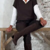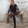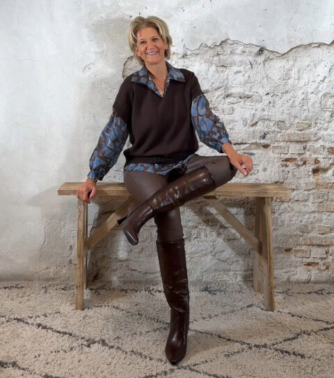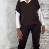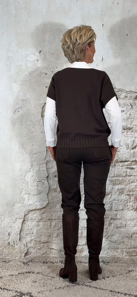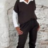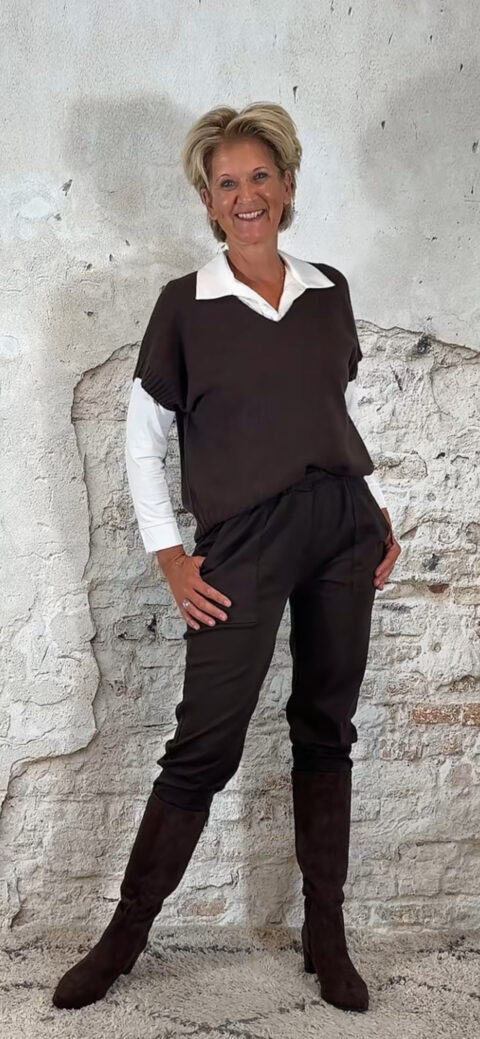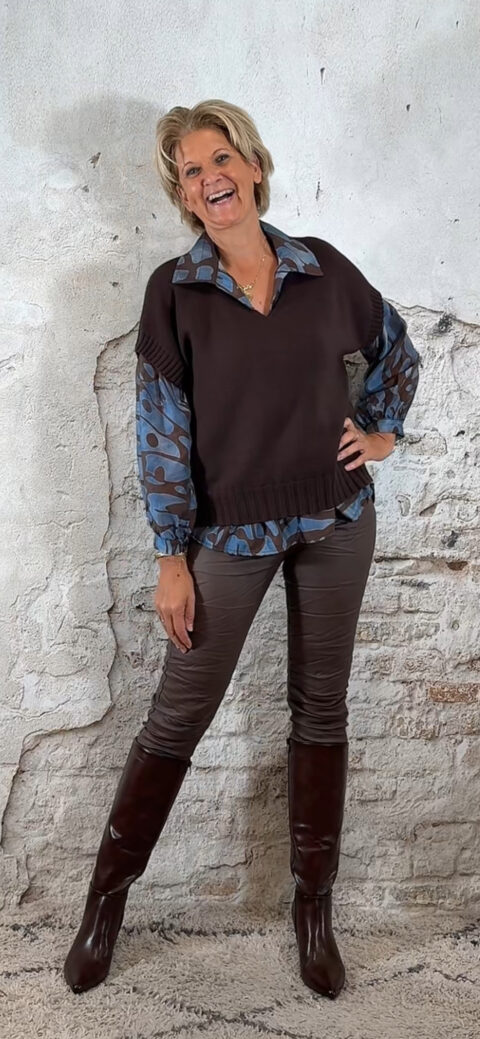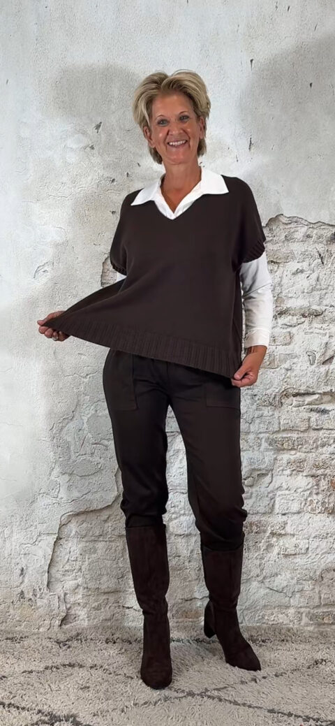 Leuk om zo te dragen, maar ook perfect te combineren met een blouse eronder. Nancy combineert hem hier met de basic polo met lange mouw uit onze collectie voor een gelaagde look.