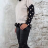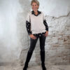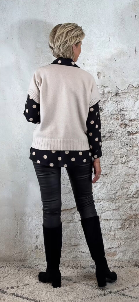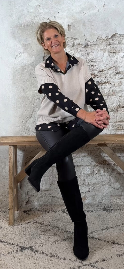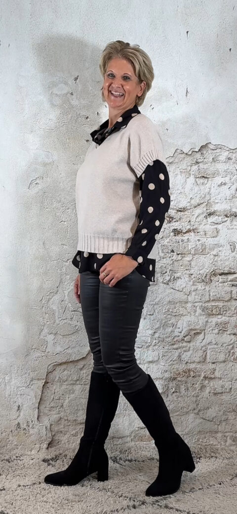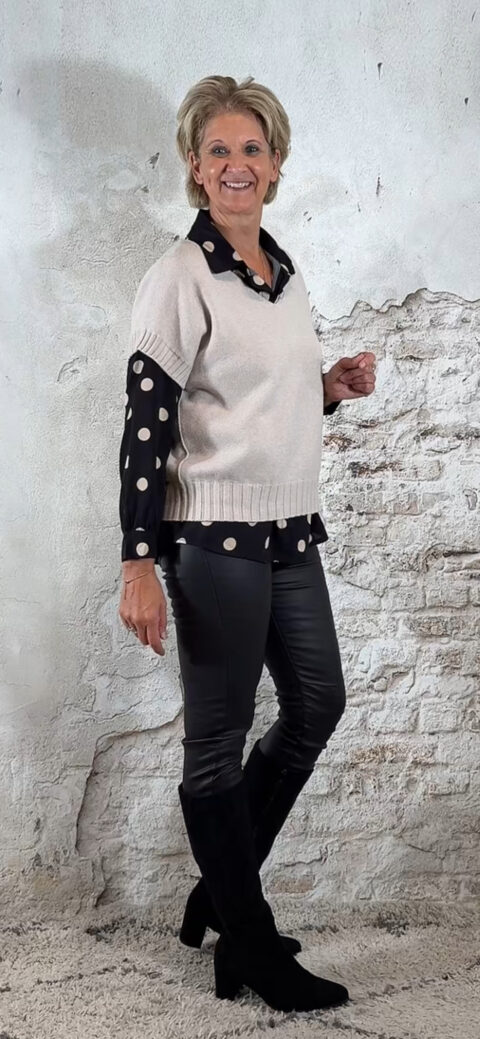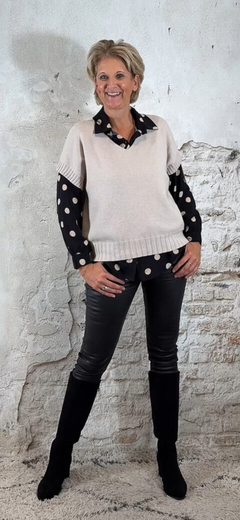 Leuk om zo te dragen, maar ook perfect te combineren met een blouse eronder. Nancy combineert hem hier met de basic polo met lange mouw uit onze collectie voor een gelaagde look.
