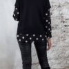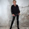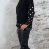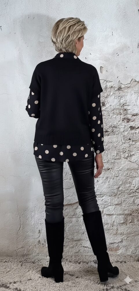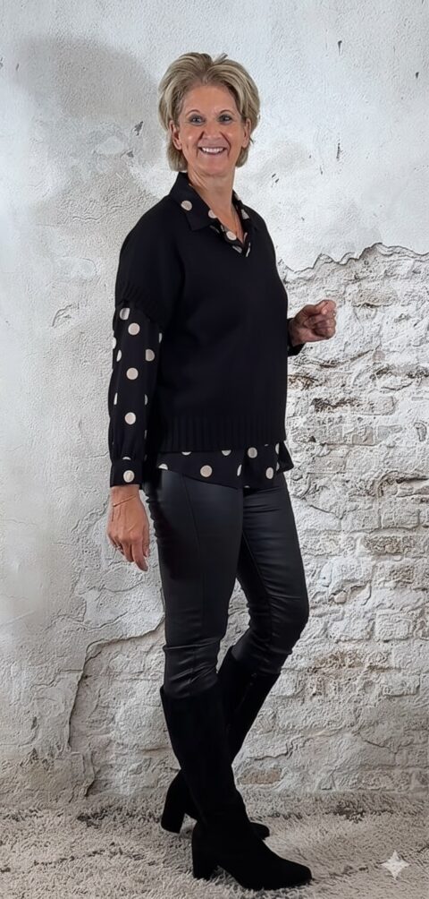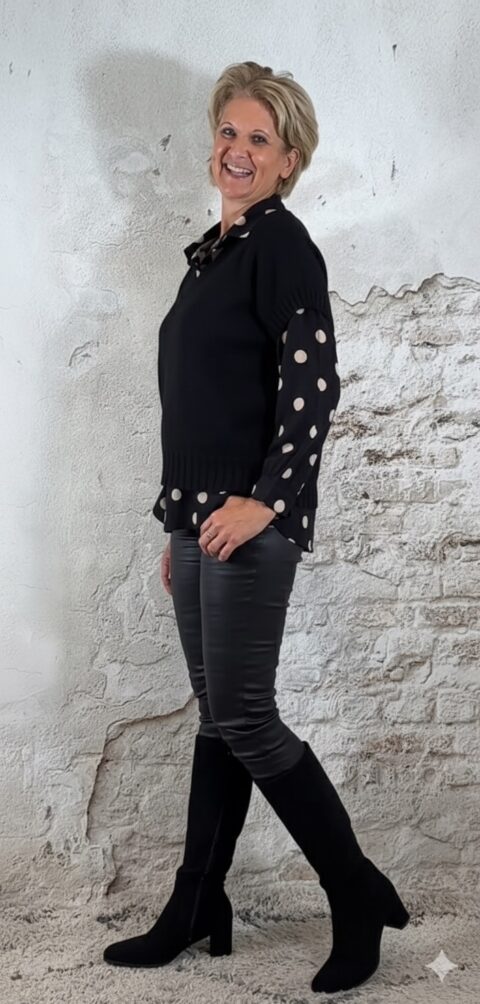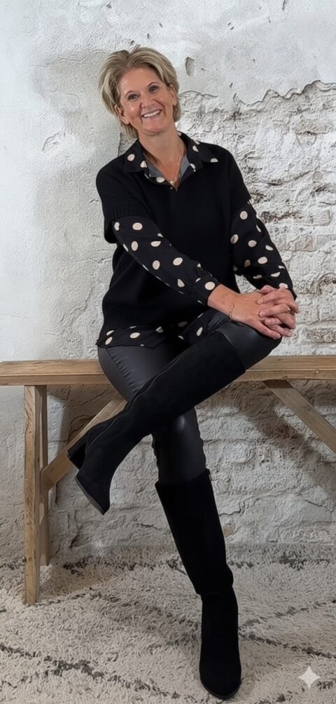 Leuk om zo te dragen, maar ook perfect te combineren met een blouse eronder. Nancy combineert hem hier met de basic polo met lange mouw uit onze collectie voor een gelaagde look.
