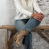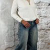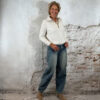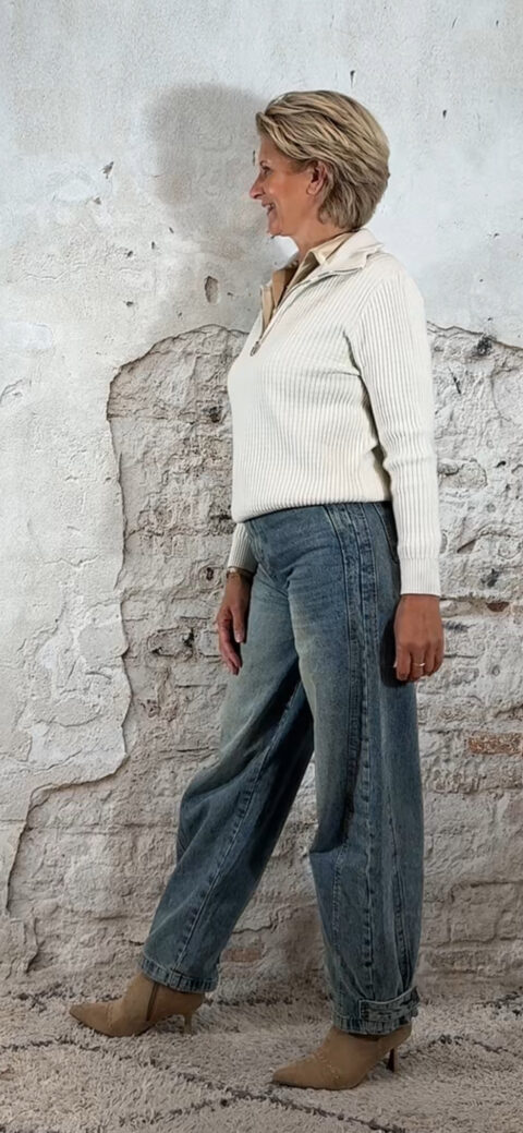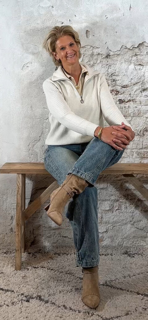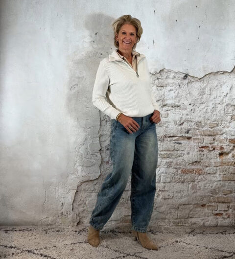 De Evy schipperstrui in ecru is een heerlijke basic trui met een moderne twist. Het ingebreide patroontje geeft net wat extra uitstraling en de col met rits maakt hem super veelzijdig. Draag de rits dicht voor een sportieve look of laat hem openvallen met een blouse eronder – bijvoorbeeld het polo blousje dat we vaker combineren.