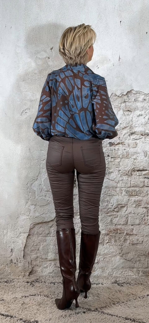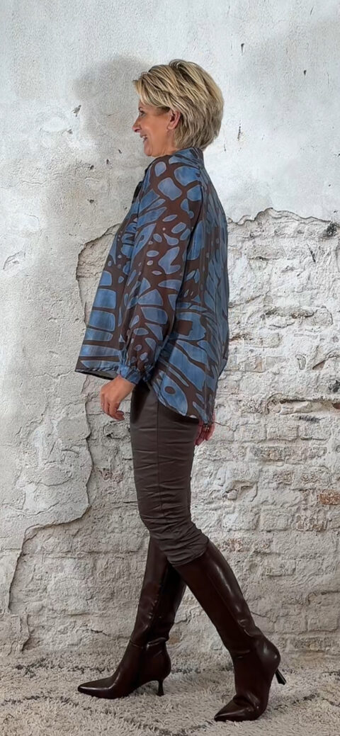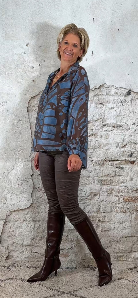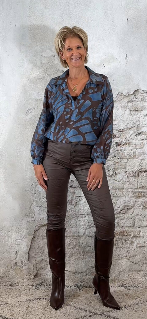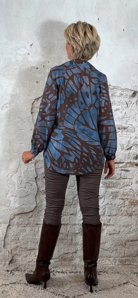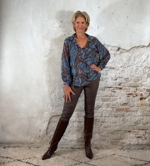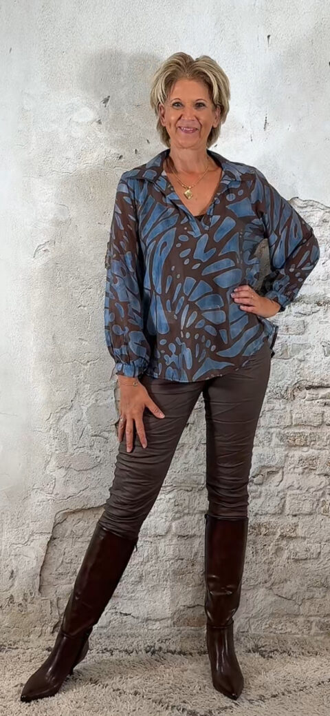 De Evy semi transparante blouse is een stijlvolle blouse in een bruin met blauwe print. Voorzien van een vrouwelijke v-hals, een kraagje, een klein boordje aan de mouwen en aan de achterkant net iets langer dan aan de voorkant.