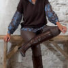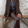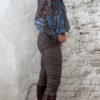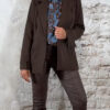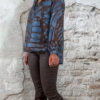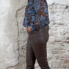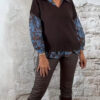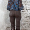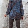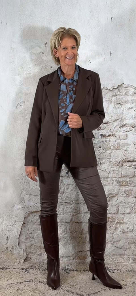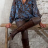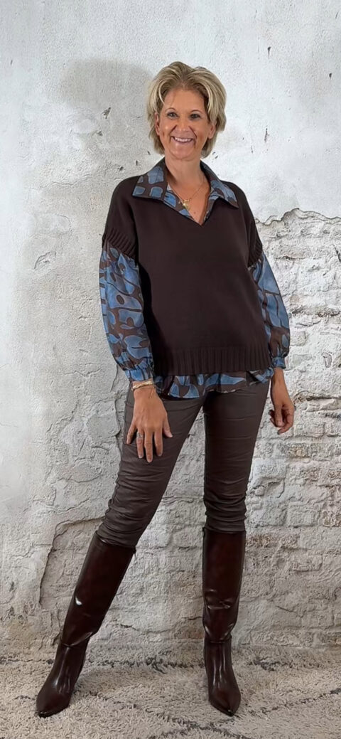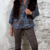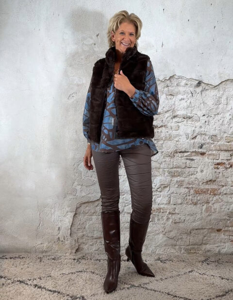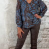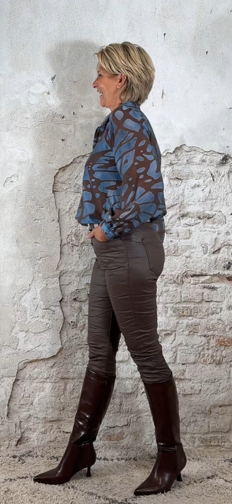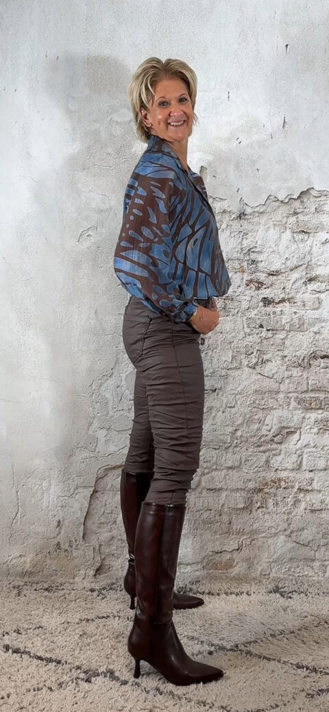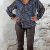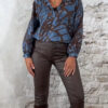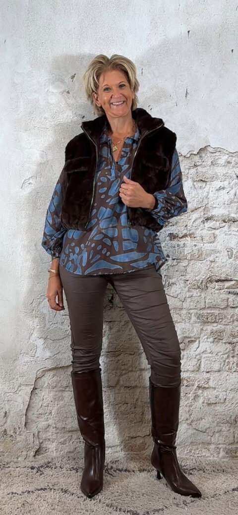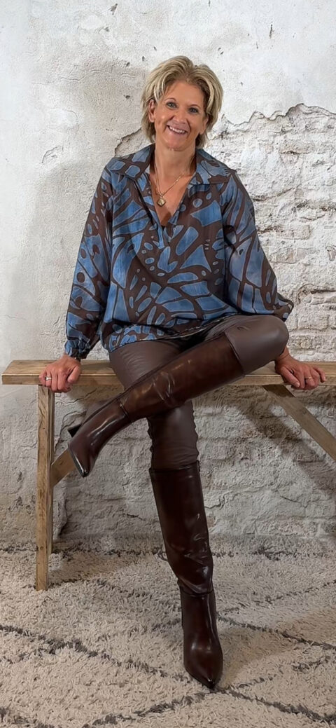 De Evy semi transparante blouse is een stijlvolle blouse in een bruin met blauwe print. Voorzien van een vrouwelijke v-hals, een kraagje, een klein boordje aan de mouwen en aan de achterkant net iets langer dan aan de voorkant.