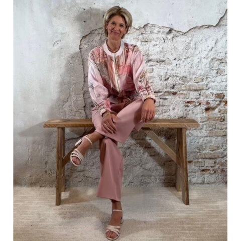 Het model heeft een fijn boordje aan de hals en sluit met een ritssluiting aan de voorkant. De mouwen zijn afgewerkt met een elastische zoom, waardoor ze comfortabel dragen en mooi vallen. Onderaan zit een koord waarmee je het model kunt laten bloezen, zodat je zelf bepaalt hoe los of getailleerd je ’m draagt.