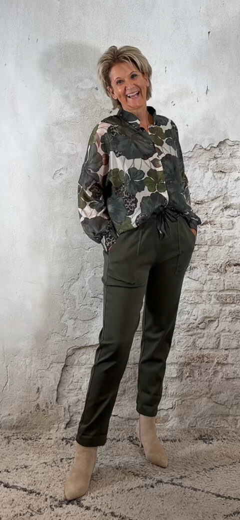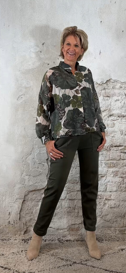 De blouse heeft een klassieke kraag en knoopsluiting, en is verkrijgbaar in vier prachtige kleuren: bruin, bordeaux, khaki en donkerblauw.