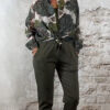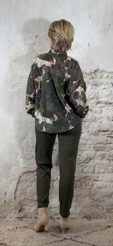 Lichte, transparante blouse met Lio Flower print in bruin, bordeaux, khaki of donkerblauw. Kraag en knoopsluiting, leuk om los te dragen of een knoopje in te leggen. One size, draagbaar van maat 38 t/m 42.
