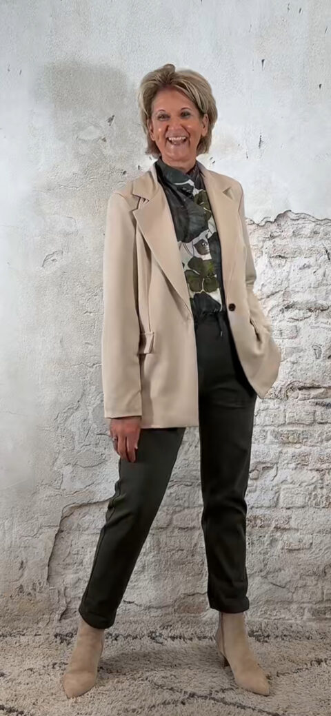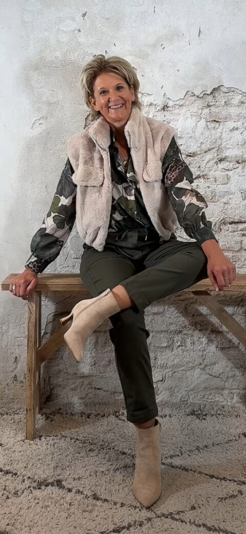 Modelinfo: Nancy is 1,72 m, draagt maat 38, heupwijdte 105 cm en taille 85 cm.