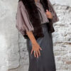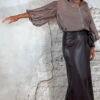 Evy transparant blouse met doorknoop en kraag, 3/4 ballonmouwen en subtiele glans. 38 – 42