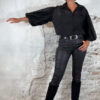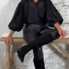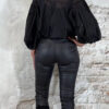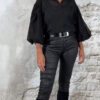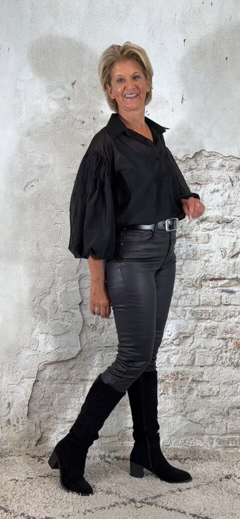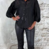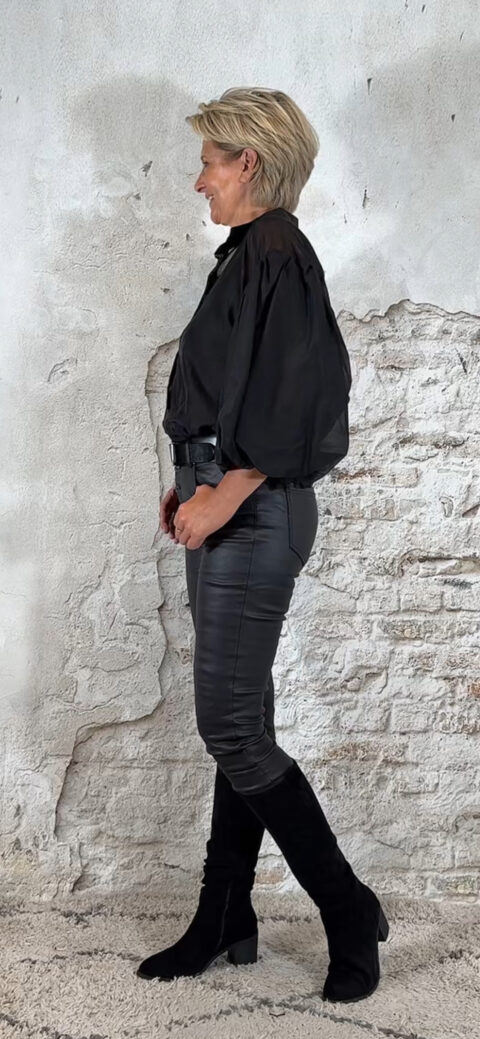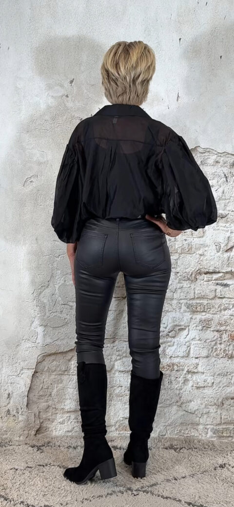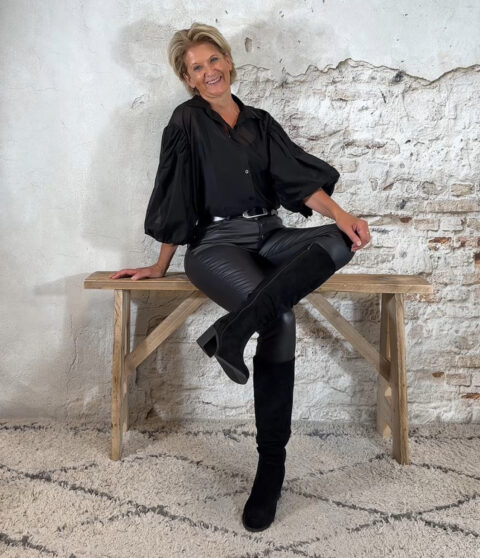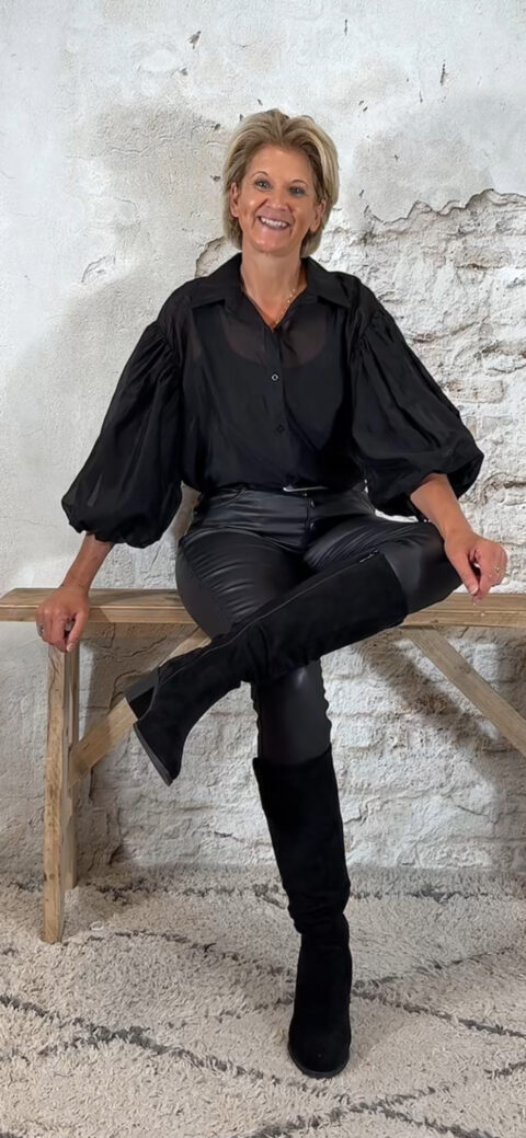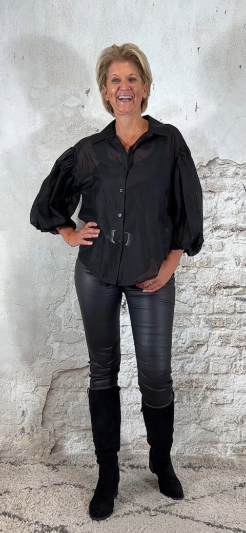 Evy transparant blouse met doorknoop en kraag, 3/4 ballonmouwen en subtiele glans. 38 – 42