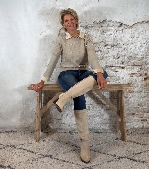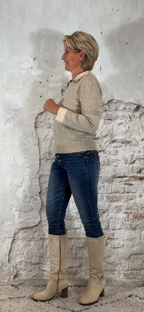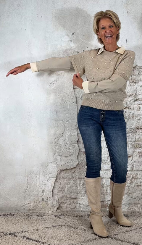 Het Evy truitje met parels is een vrouwelijke knit met korte mouw en elegante details. Het model is versierd met een mix van grotere en kleinere parels, die stevig zijn vastgestud in de stof – ze blijven dus mooi op hun plek, ook bij veelvuldig dragen.