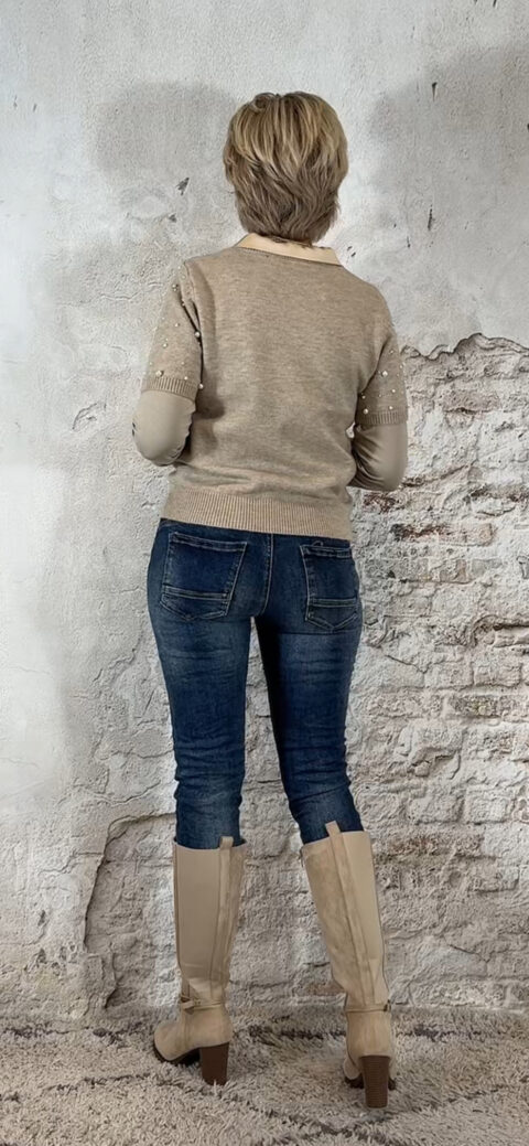Wasadvies: wolwas 30 graden, bij voorkeur binnenstebuiten om de parels te beschermen, liggend laten drogen.